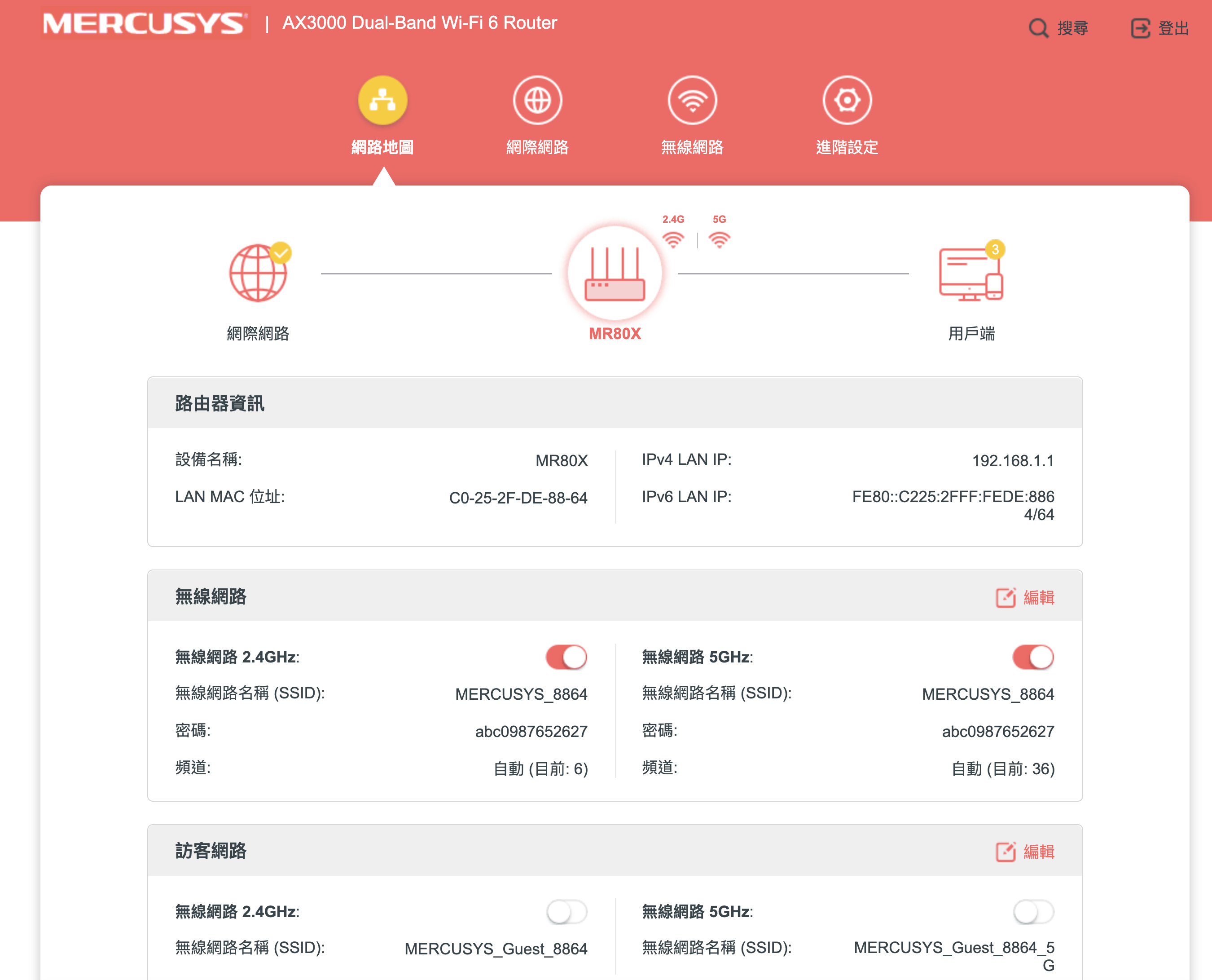 目前 MERCUSYS 設定無線路由器是透過網頁介面,不過之後待 MR80X 韌體更新後就可以透過 APP 進行設定了,不論透過哪一個其實都很簡單,下面阿湯就簡單的分享一下網頁的操作介面,在預設的介面下,網路地圖這裡可以查看目前的網路狀態、設備連線數量等。