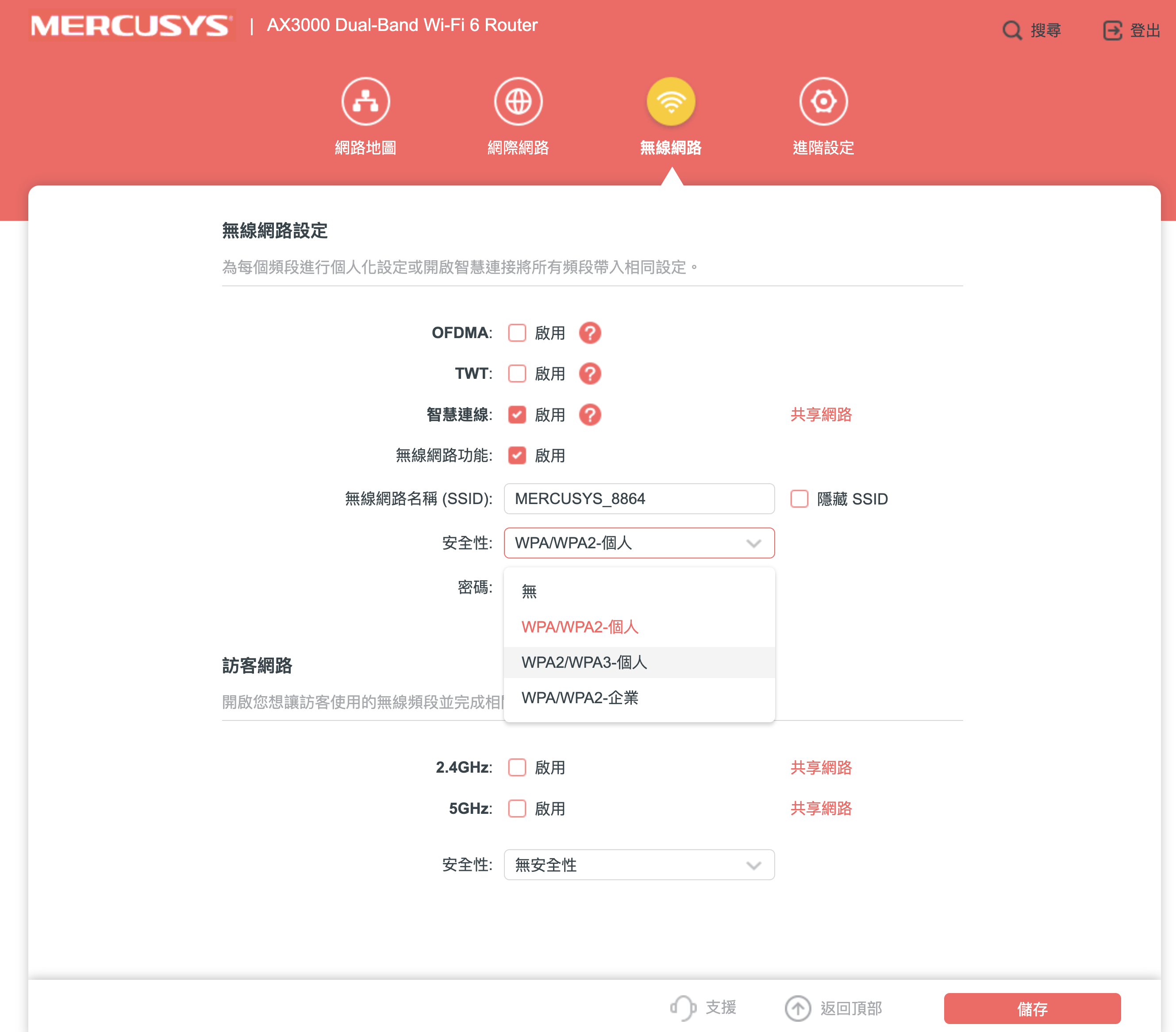 無線網路中,主要就是設定 SSID 及密碼,其中有幾個重要功能也在這裡,像是 OFDMA,這主要是可以減少網路頻寬擁塞情況,而智慧連線是將 2.4Ghz 及 5Ghz 二個頻段合併為同一個 SSID,然後依設備連線自動判定要使用哪一個頻段。