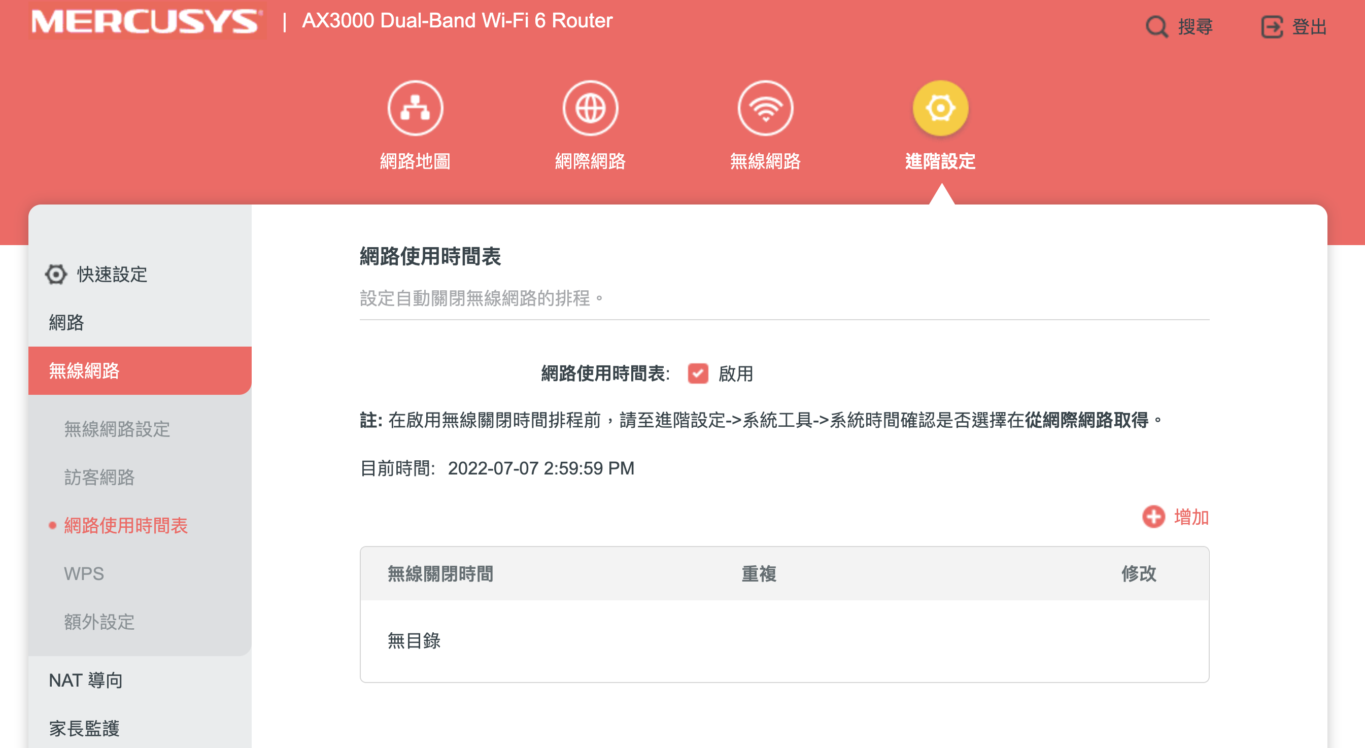 阿湯也提供幾個不錯的功能,像是網路使用時間表,你可以針對需要的使用時間設定無線網路開關的時間,像有些人就會怕自己不在或睡覺時間有人在偷用你的 Wi-Fi,這是有可能的,因為我就不小心猜到隔的密碼偷偷用過....