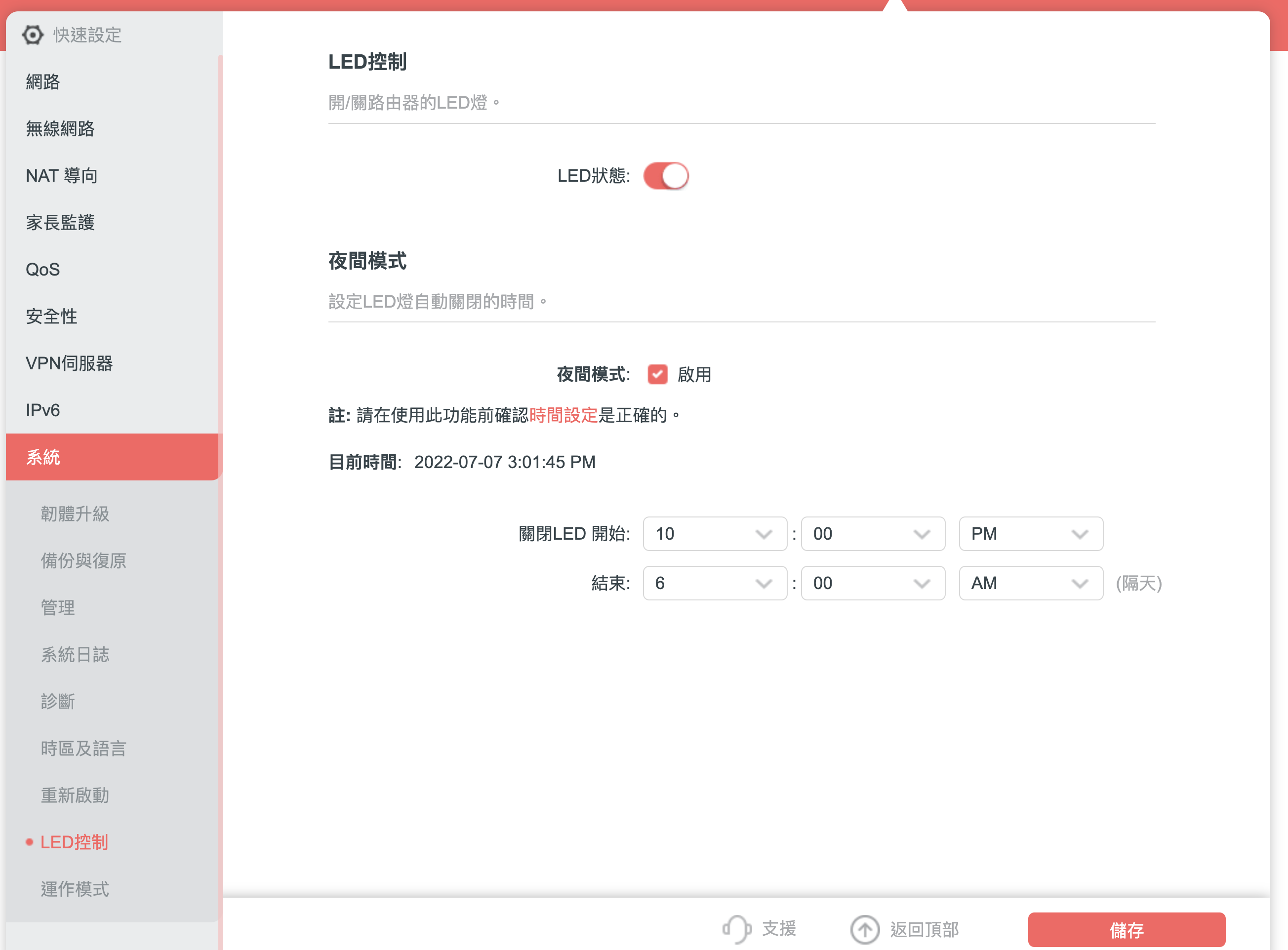 最後分享個我覺得很貼心的小功能,如果是住套房的人,通常路由器的燈號在半夜就是會一直閃亮亮,如果你對於光線不那麼敏感,應該就沒什麼差,但像阿湯睡覺是不能有光線的,就會需要全關掉,他在這裡面就多了個 LED 的控制選項,讓你自由選擇是否要關掉燈,或者只在特定時間關閉,非常貼心的小功能。