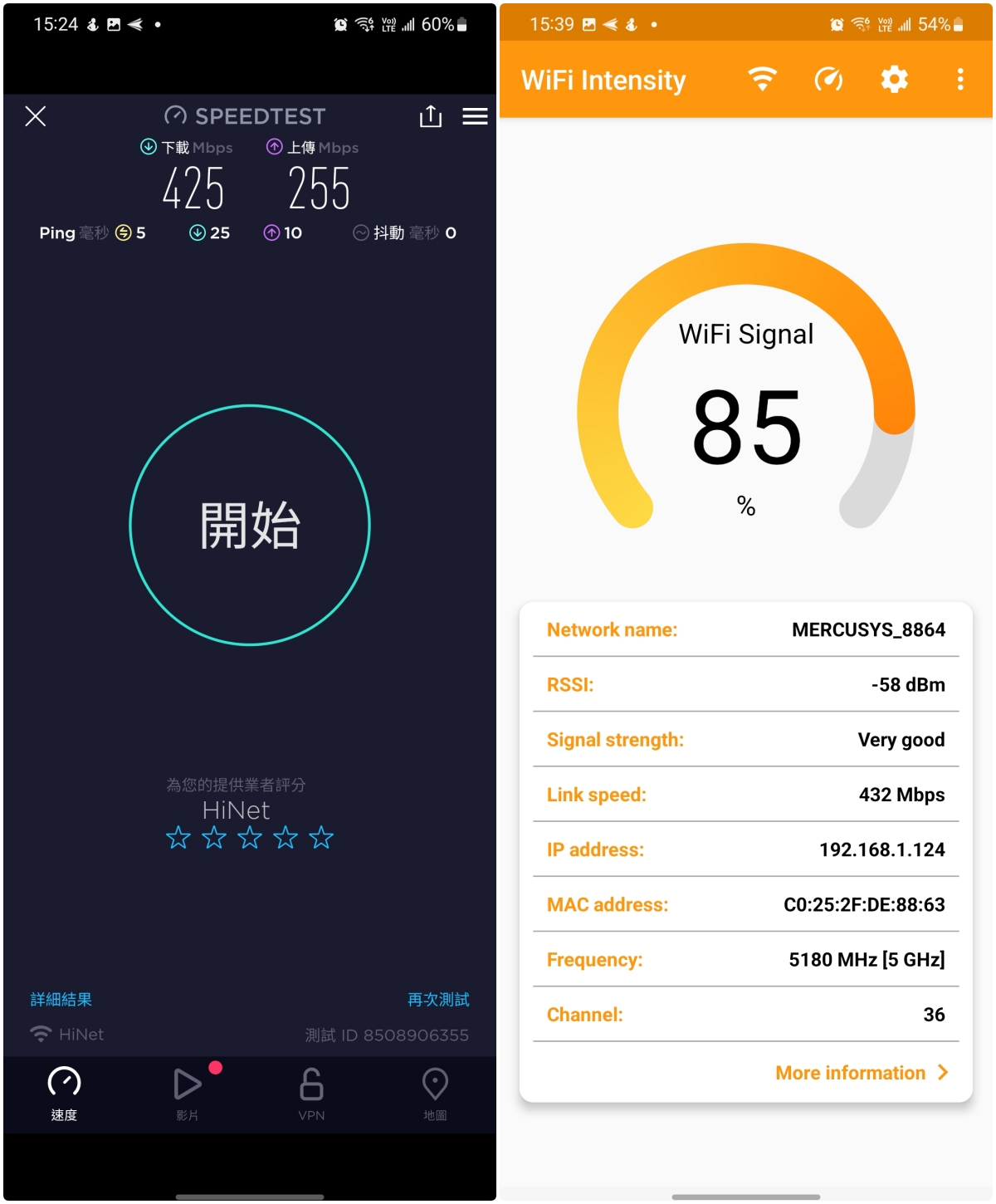- Wi-Fi 訊號強度:-58dBm