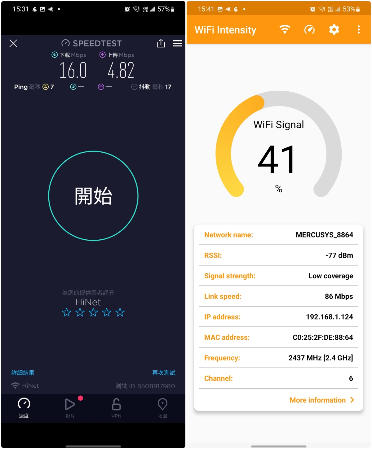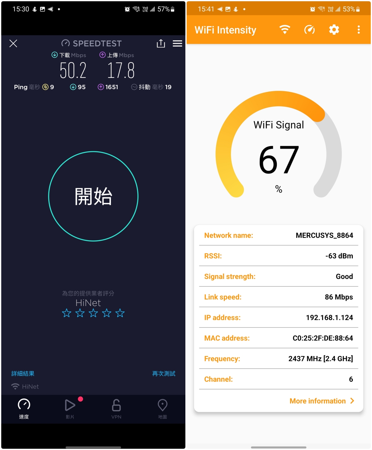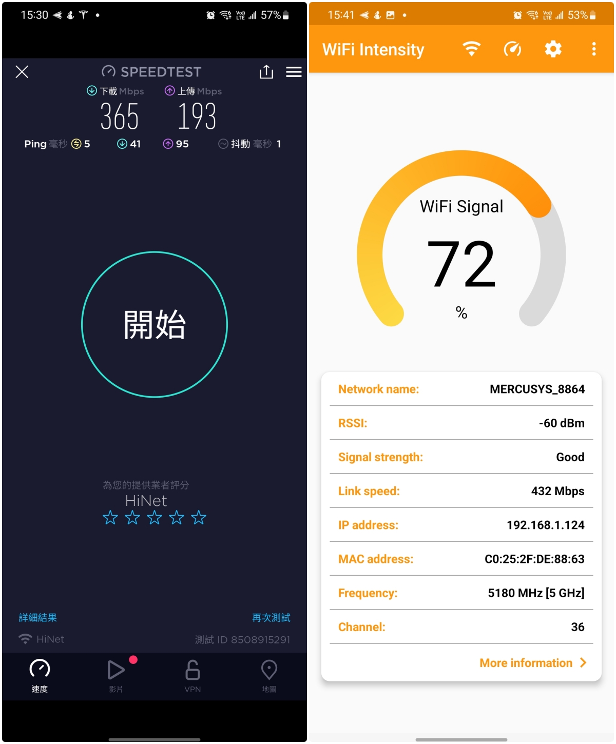 - Wi-Fi 訊號強度:-52dBm