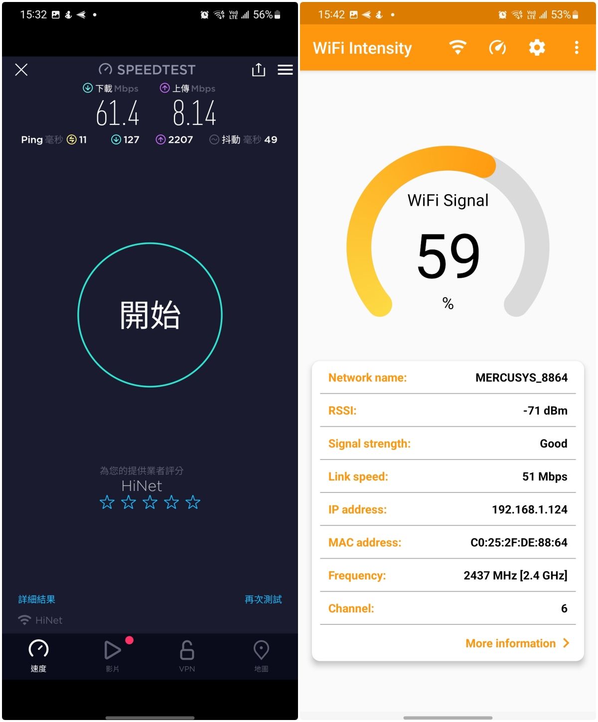 - Wi-Fi 訊號強度:-56dBm