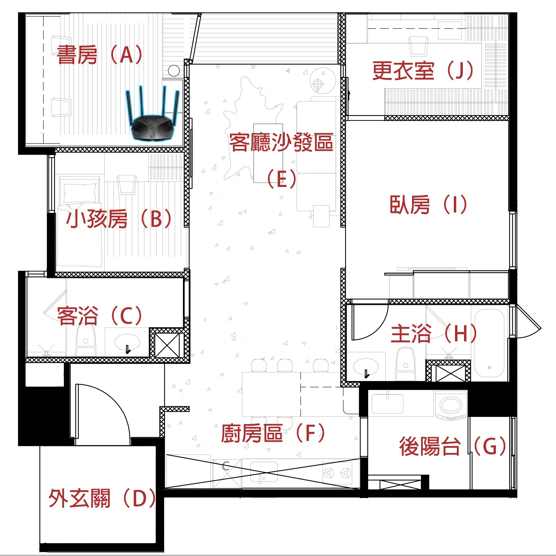 我們今天要實測的就是阿湯已經入住快二年的新家,室內實際坪數大約是 27~28 坪左右,比起先前的舊家足足大了有 12 坪左右,差非常多,因此可以測試的點也多了很多啊,為了更極限一點的感受一下這 MR80X 可以達到什麼程度,阿湯將他擺放在最邊緣的書房裡面,然後在家中各個角落共十個點進行測速及 Wi-Fi 訊號強度檢測,看看每個角落還可以保有多少網路速度及訊號強度。