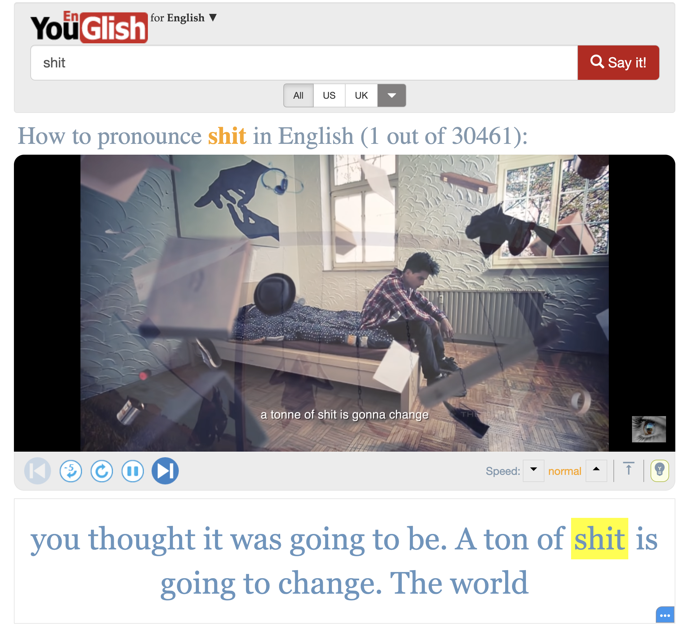 搜尋之後就會幫你從 YouTube 找出有這單詞的影片,按播放後大概幾秒之內就會播到這個單詞,下方也會單獨放大顯示字幕。