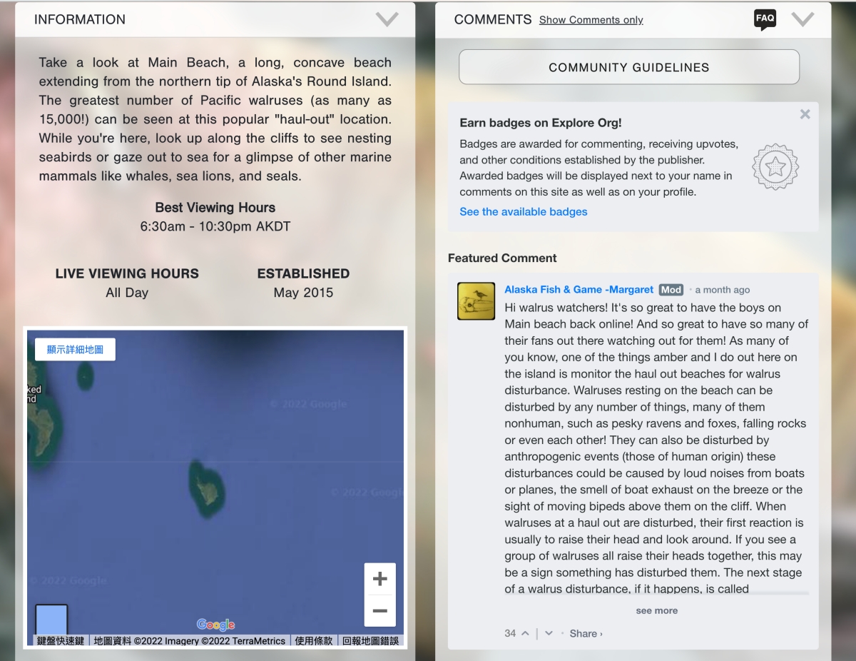 網站:https://explore.org/livecams/進入網站後,上方就有各種分類,不論看不看得懂英文都沒關係,點下去就對了,一個一個找到你想要看的內容後就可以直接看到影片,大部份都是直播,也能回放 12 小時內的畫面。