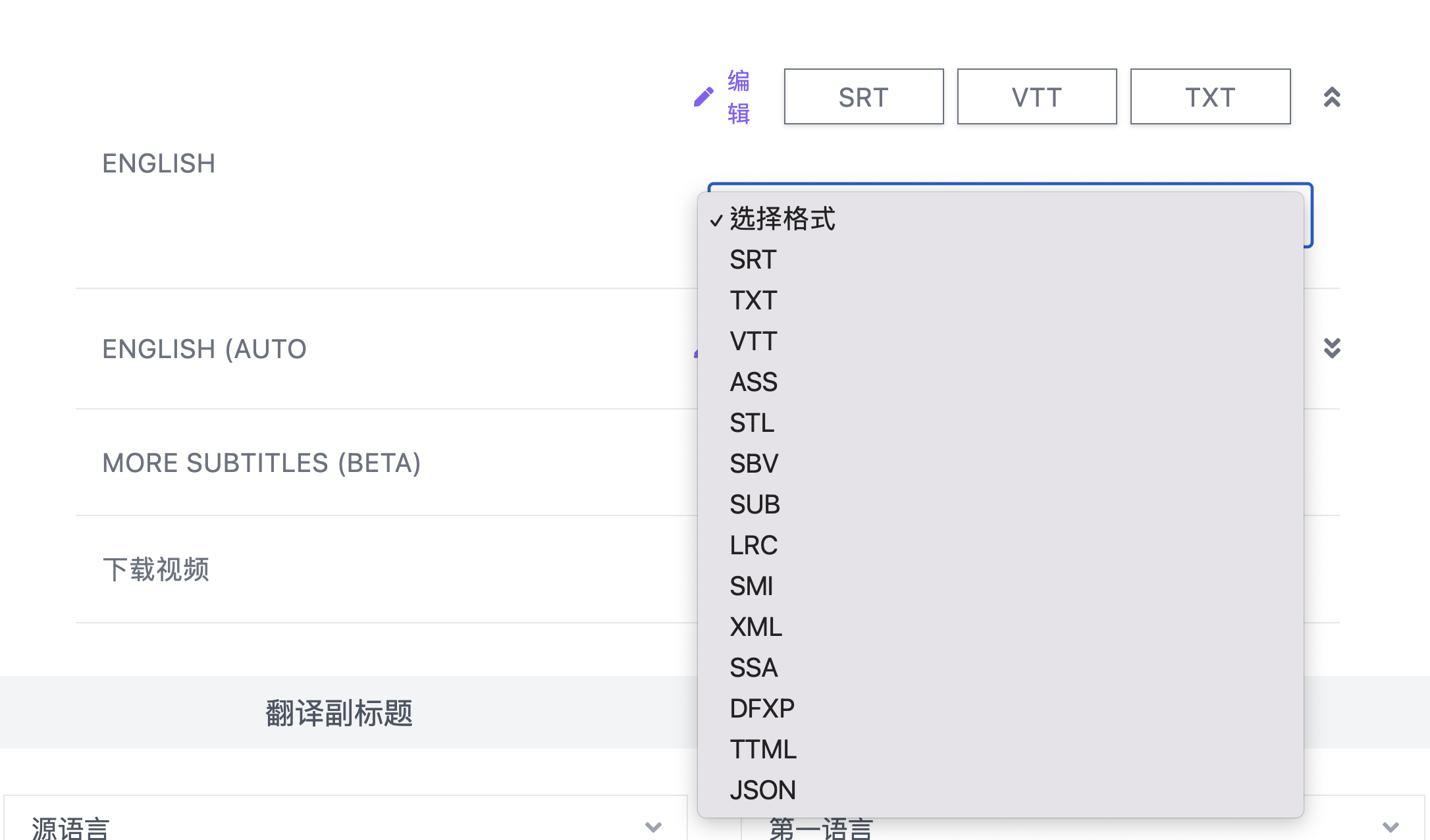 接下來就會在下方顯示各種格式的字幕檔可以選擇下載,或是可以點擊編輯進入,做好調整後再下載。