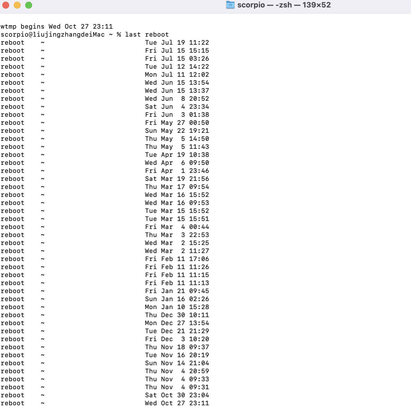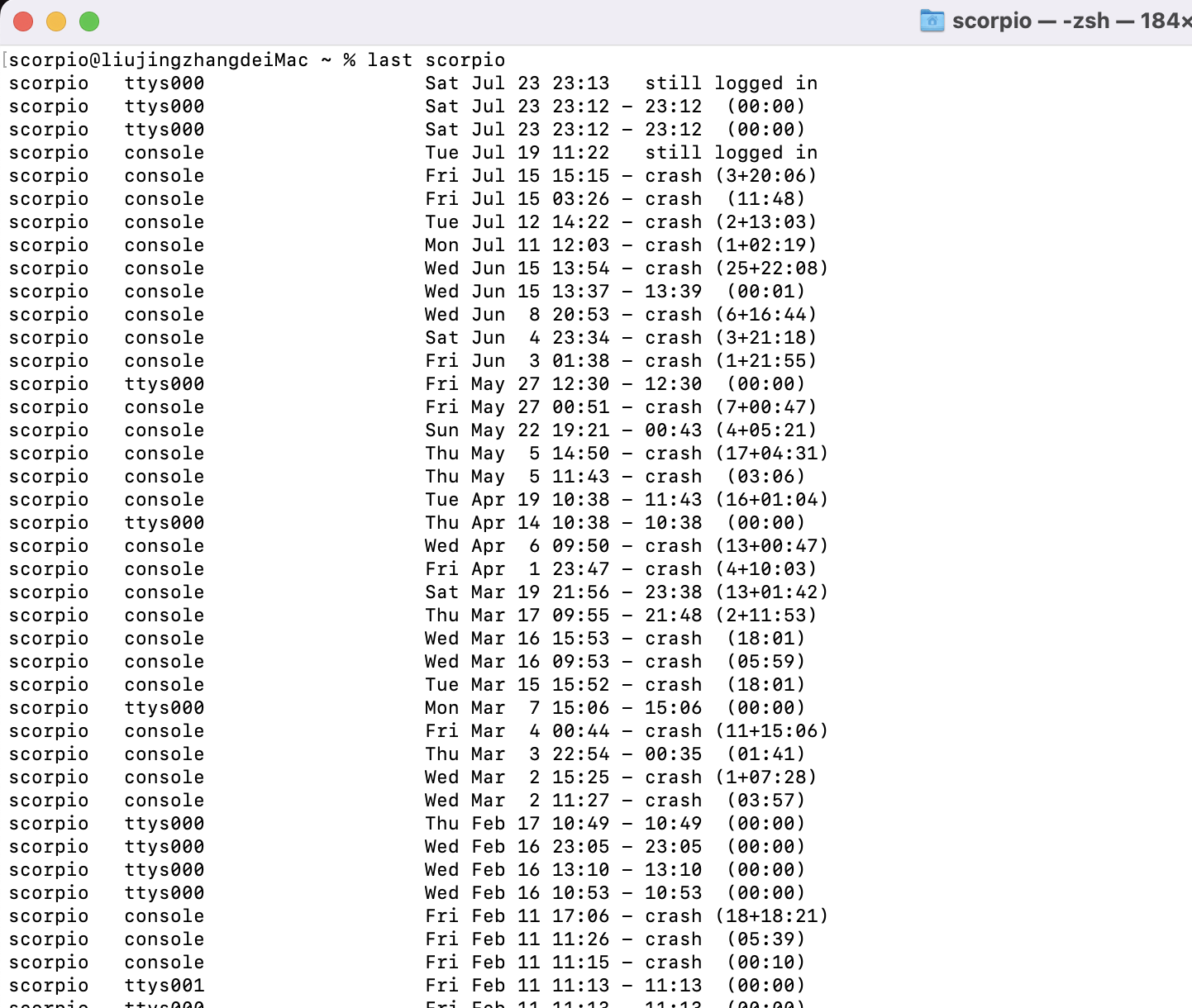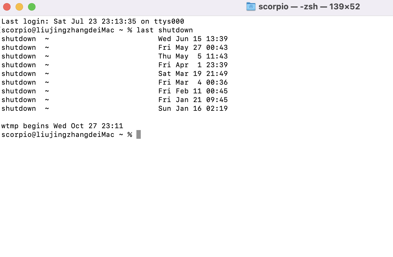首頁 › 電腦小教室 › macOS 教學 - 如何查看關機、重開機、使用者登入的記錄? macOS 教學 - 如何查看關機、重開機、使用者登入的記錄? 發佈日期:2022/7/24 作者:阿湯 分類:電腦小教室 久違的來個 macOS 的教學,我們都知道 Windows 系統裡要查詢開關記錄、登入記錄並不難,有很多方式可以達成,而 macOS 裡呢?當然也會有保留這樣的記錄,包括像是關機記錄、重開機記錄、使用者登入的記錄等,今天就來教大家要怎麼快速查看這幾項記錄,只要簡單的透過指令就能完成哦。 macOS 教學 - 如何查看關機、重開機、使用者登入的記錄? 首先是查看關機記錄,什麼時候關過都能看,只要在終端機裡輸入「last shutdown」,就能查看詳細的關機記錄,像我這裡最往前可以查到今年 1/16,我通常只有整線才關機,平常是沒在關機的。 再來是查看重開機的記錄,指令輸入「last reboot」一樣就能查看。 最後一個是查看使用者的登入記錄,指令是「last 使用者名稱」,比如我的是 scorpio,那就是輸入 last scorpio,很簡單吧,快去試試吧。