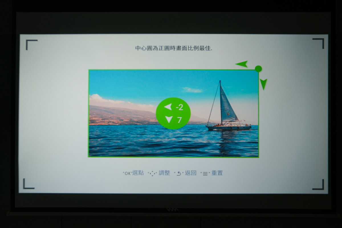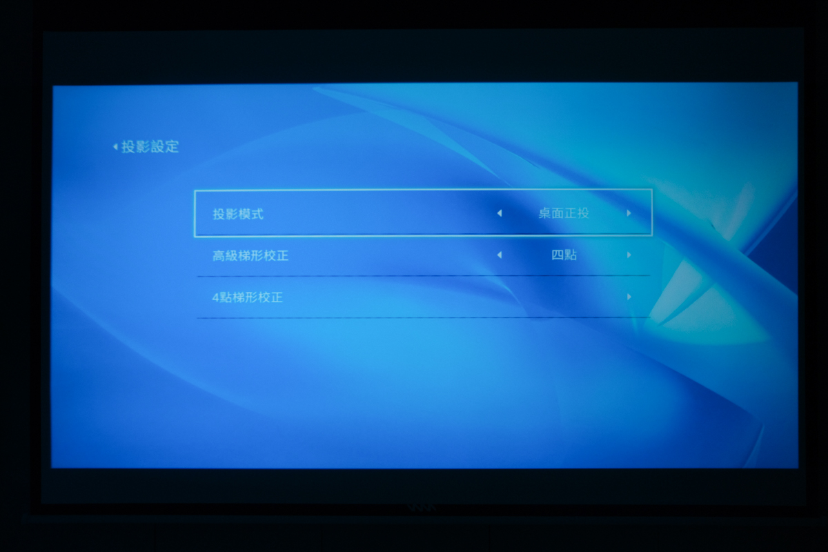 第一次安裝好後,可以透過內建的梯形校正功能來調整,最簡單的就是選四點模式,不到 30 秒就可以調整好角度跟畫面囉,如果你投影機不會拿來拿去,第一次調整完就會自動儲存你的設定,即便你會到處用也沒關係,調整非常的簡單,馬上就可以搞定了。