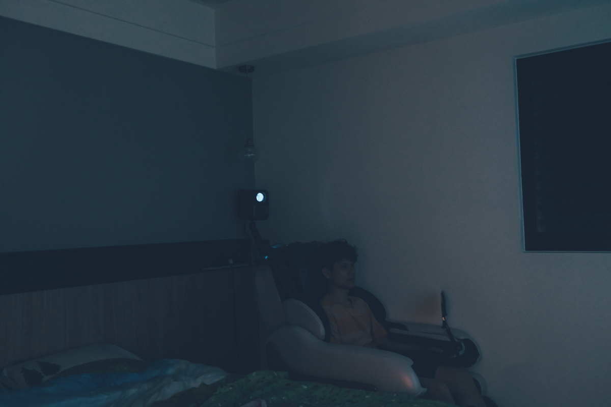 而且我們還在臥房裡放了按摩椅,哈哈哈,不只是沉浸在投影機的世界裡,還整個在按摩椅上大放鬆。