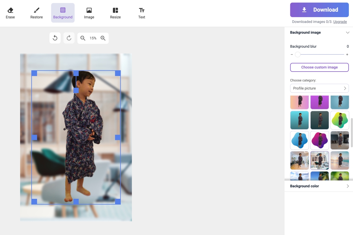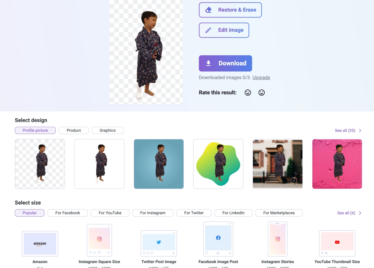 去背處理完後,還可以選擇要套用的背景,或是裁切的大小。
