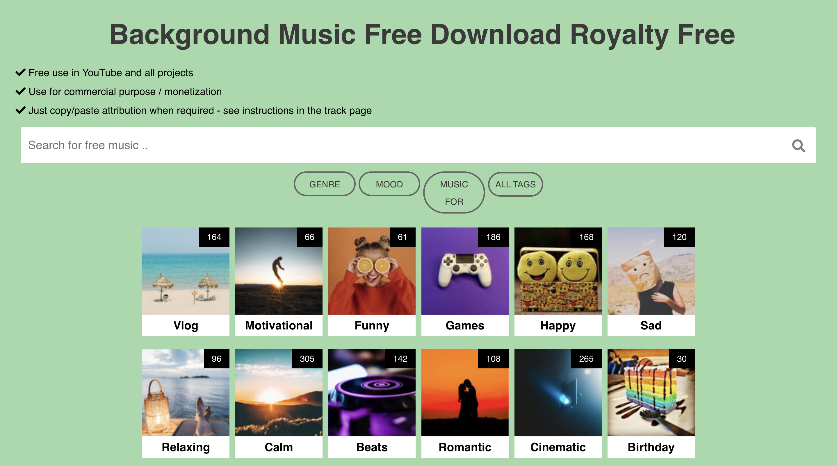 網站:https://www.chosic.com/free-music/all/進入網頁後,直接搜尋想要的音樂或者透過下方已經分類的類別去找看看。