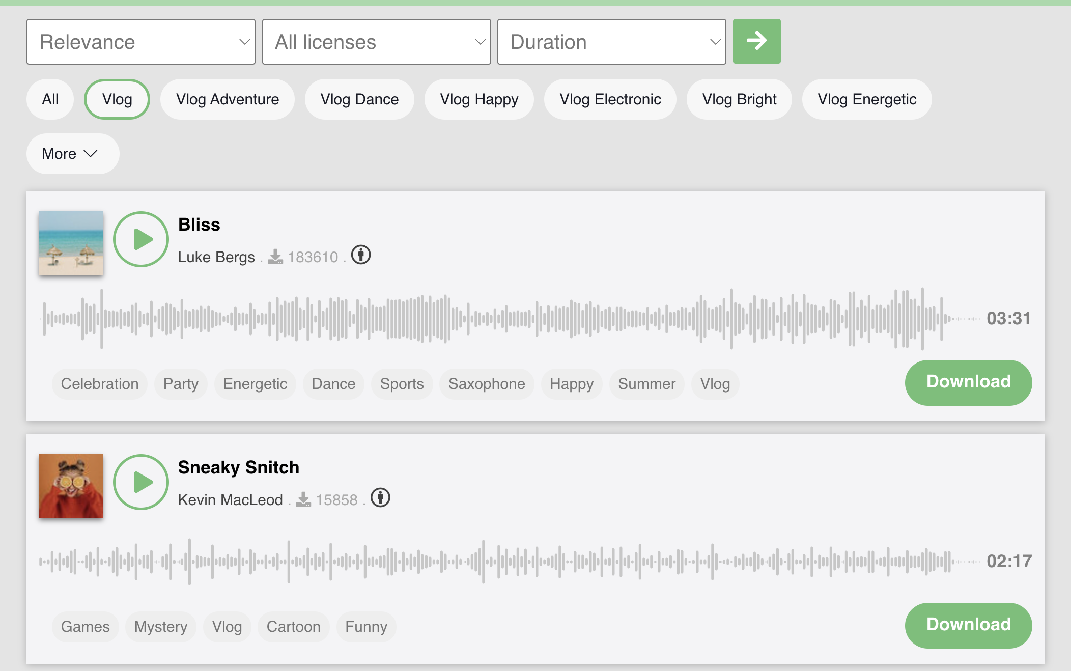 每首音樂都可以直接預覽聆聽,還可以直接點擊時間軸快速聽一下後面的片段,喜歡再進行下載。