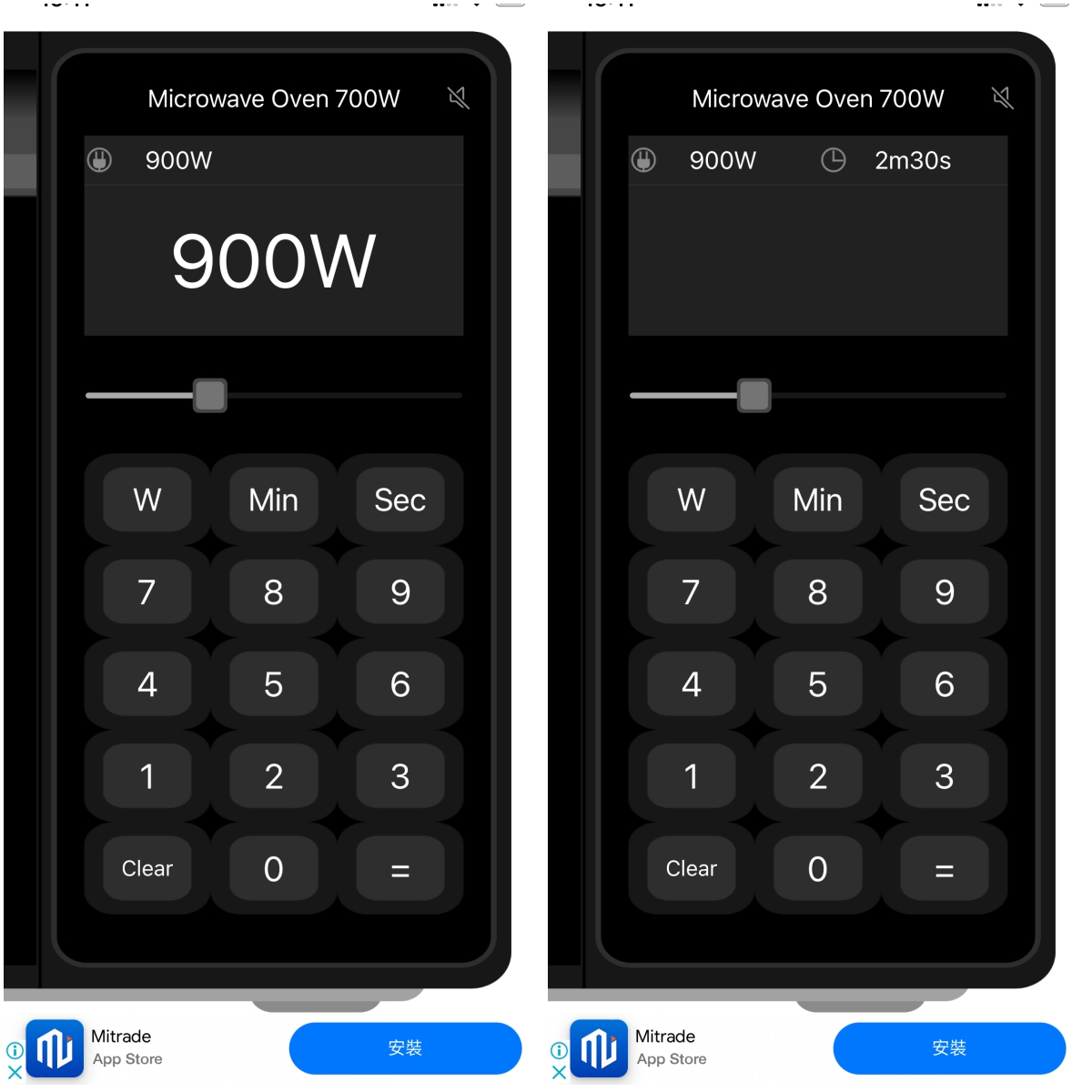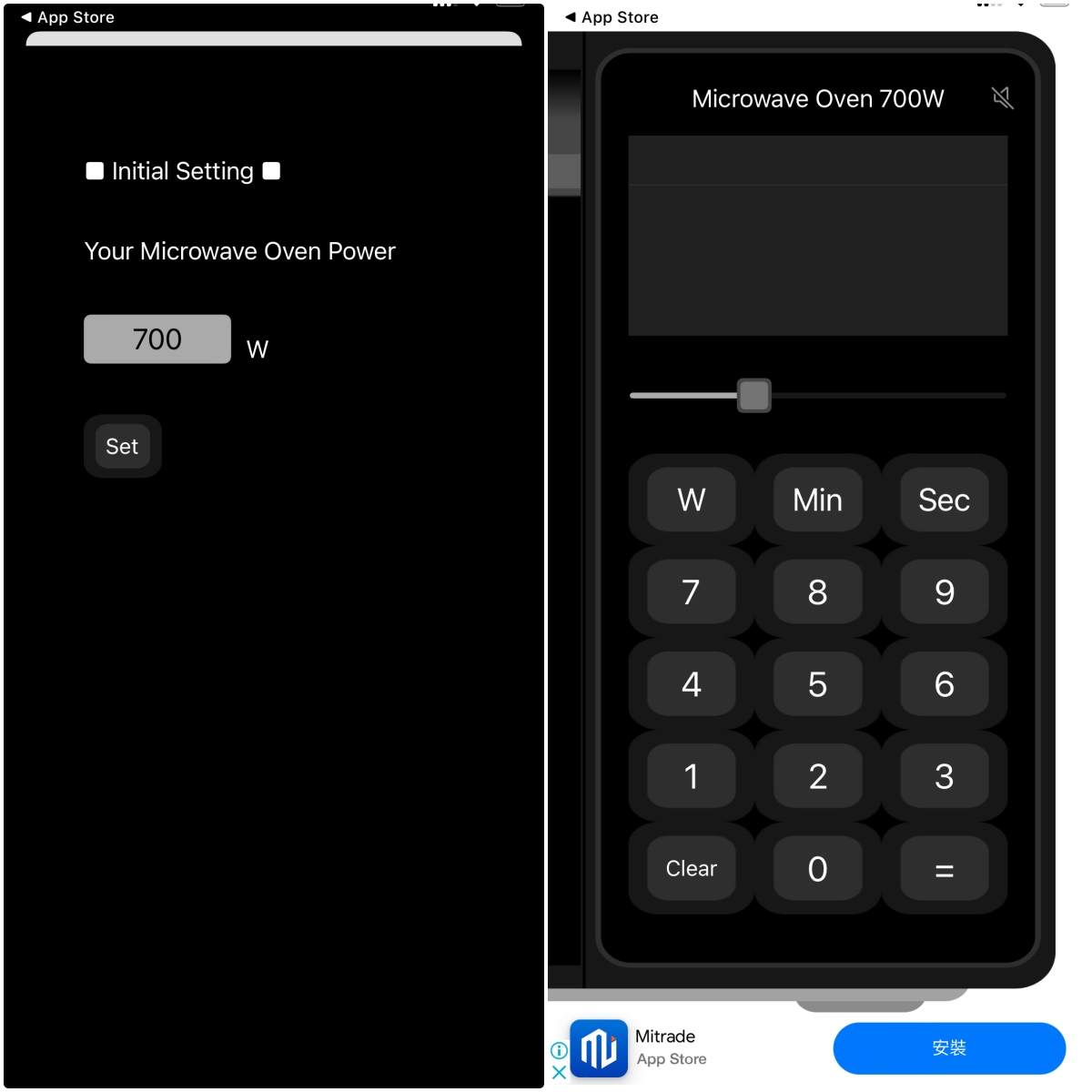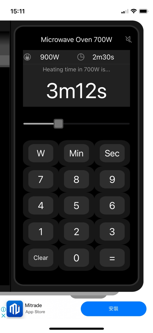 APP 下載:iOS(目前沒有 Android 版本)第一次使用會問你的微波爐瓦數多少,不過這個後續隨時可以調整,進入後就是長一個計算機的樣子,中間那條拉桿就是可以調整你目前微波爐瓦數的地方。