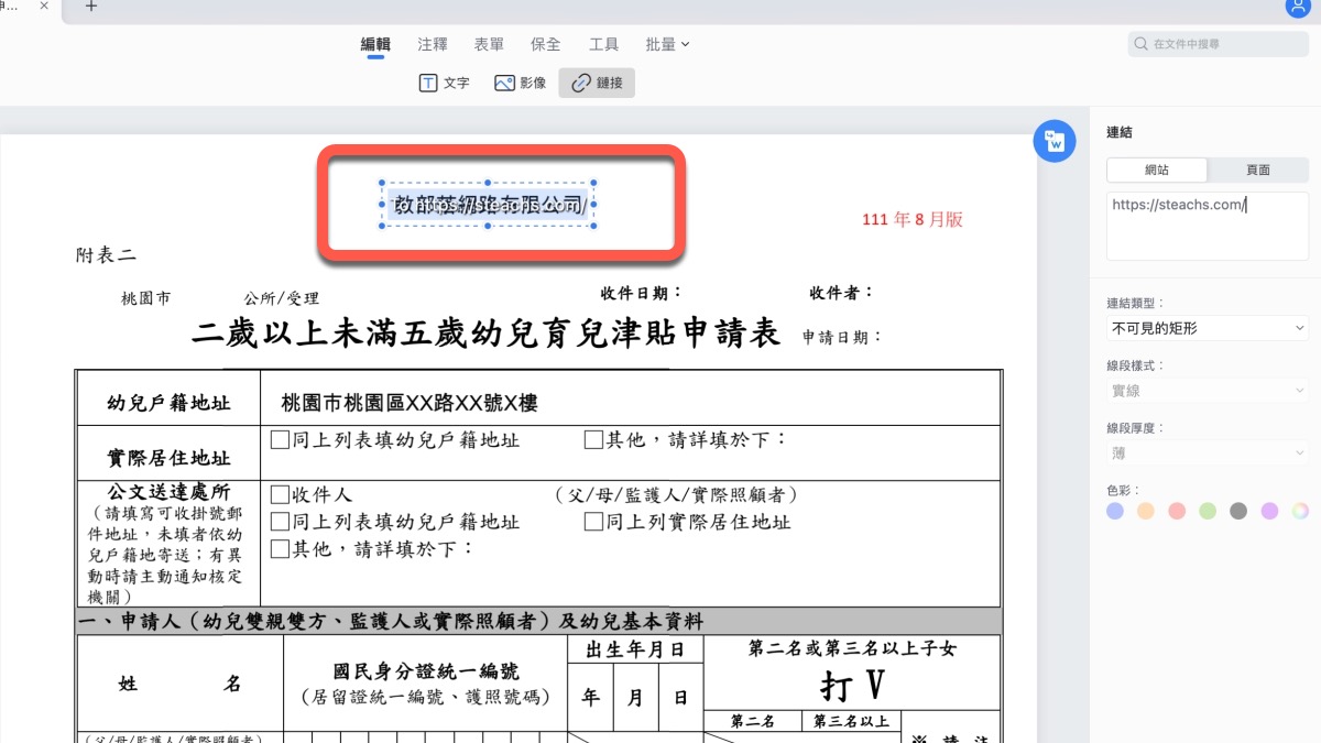 其中我覺得很方便的一個功能就是連結,自訂連結以往,如果你是在 Word 裡編輯的話,那麼轉成 PDF 時,會只有該文字可以點擊,但是有時文字如果很少,不好點的話,像 PDFelement 是直接可以設定一個區域,直接是超連結,就不用侷限在某個文字的連結,運用起來也更加方便。