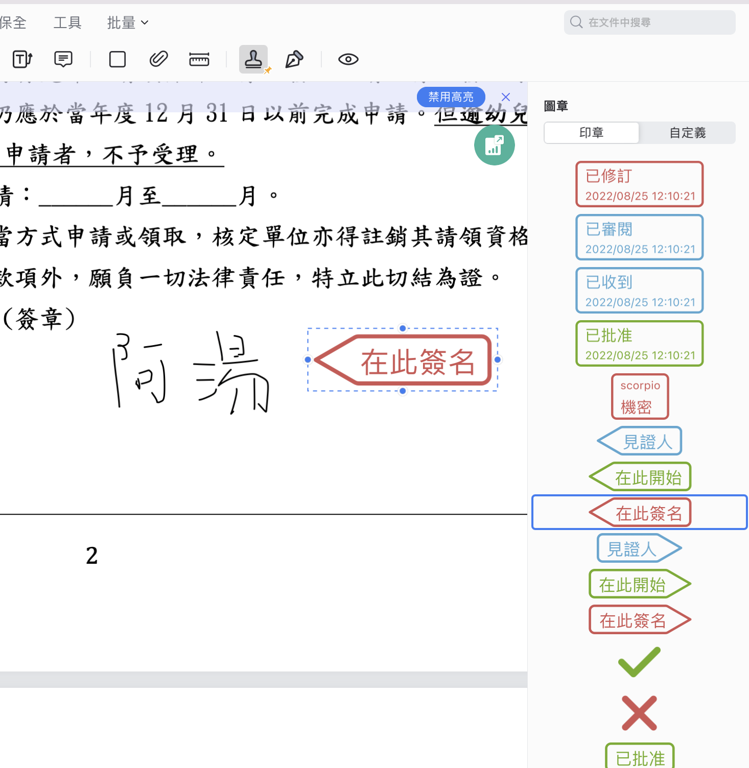 如果你是要請別人簽署 PDF 的那一方,需要提醒別人要填寫哪些資源,或者製作一個要填寫的範例等,就可以利用內建的這些圖章功能,或者也能自定義上傳更多圖章。