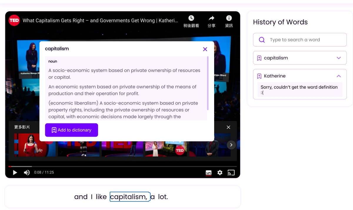 只要有內建 YouTube 字幕的,在播放時會在下方同步顯示字幕出來,這時如果有看到不懂的單字,直接點擊該單字。