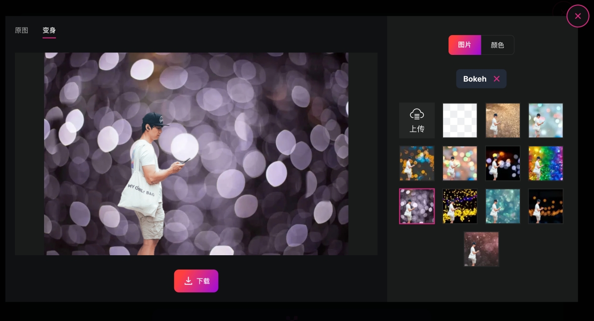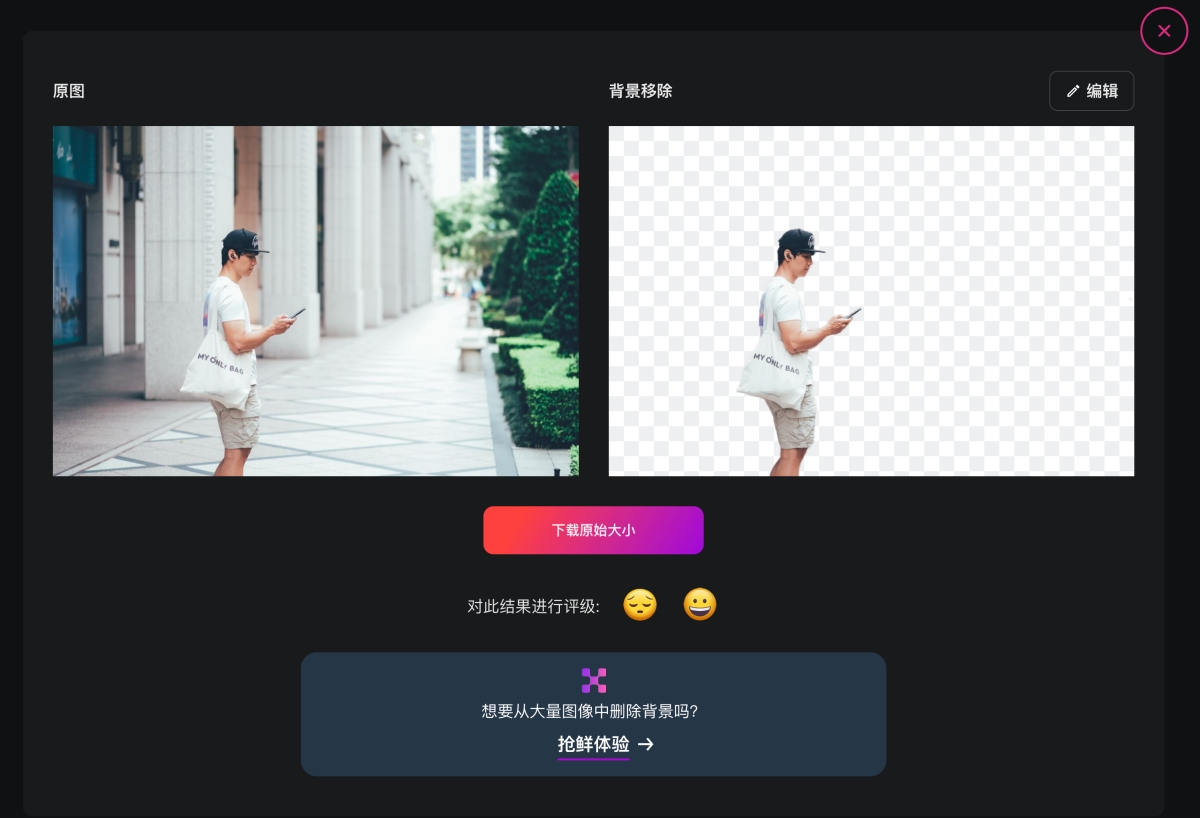 等個幾秒後就完成去背囉,這時如果你沒有其它需求,可以直接下載原始大小,如果想要直接取代背景,內建也有一些樣式,可以點擊右上角的編輯進入。