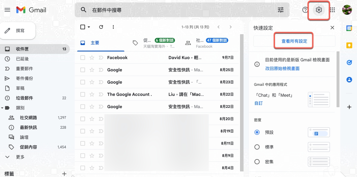 阿湯這邊就用電腦網頁版來說明比較方便,手機也能查看,但有點麻煩,用電腦網頁版進入到 Gmail 後,透過右上角的設定進入查看所有設定。