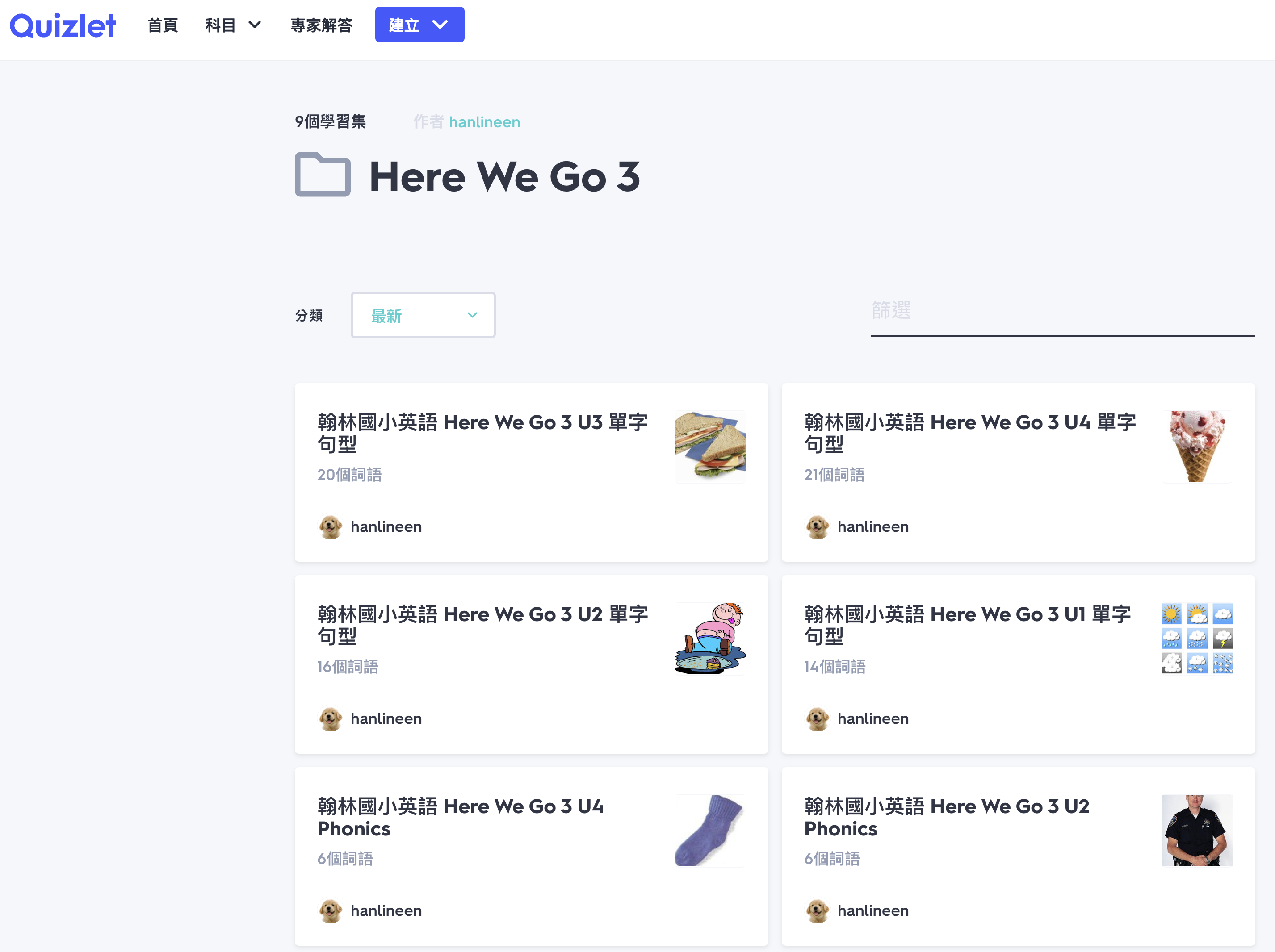 也有透過 Quizlet 製作的英文學習集內容。