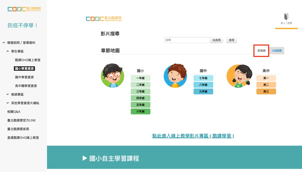 進入網站後,可以透過右上角先行註冊登入,不過在沒有註冊的情況下,我試了一下,應該只有酷課 OnO 線上教室不能用,國小~高中職資源區一樣是可以直接讀取的。