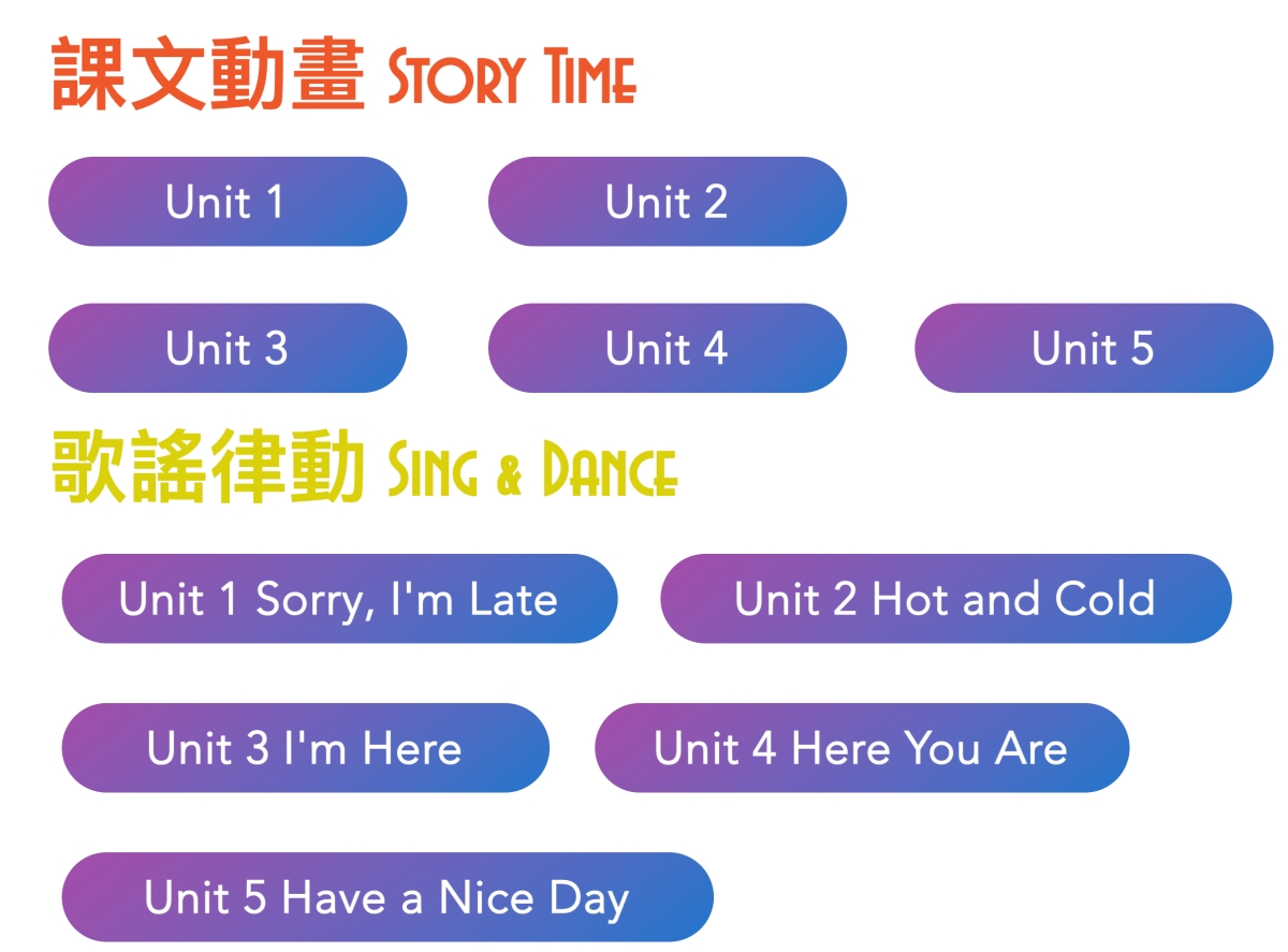 內容主要是影音,分為課文內容跟歌謠律動。