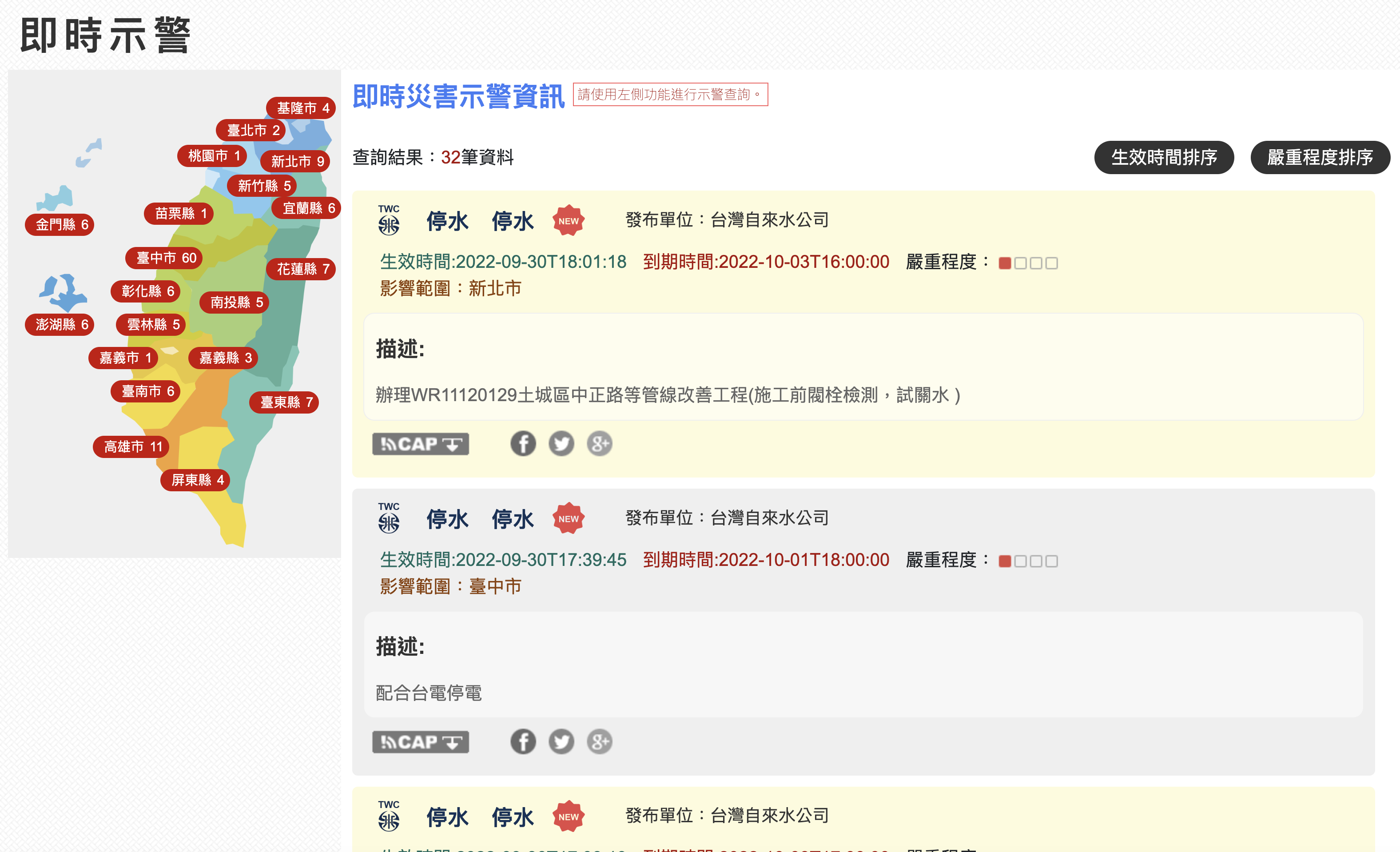 網站:https://alerts.ncdr.nat.gov.tw/indexHome.aspx進入網站後,在首頁就有各種示警資訊的類別可以選擇,,直接點擊就可以看各類別的相關示警資訊。