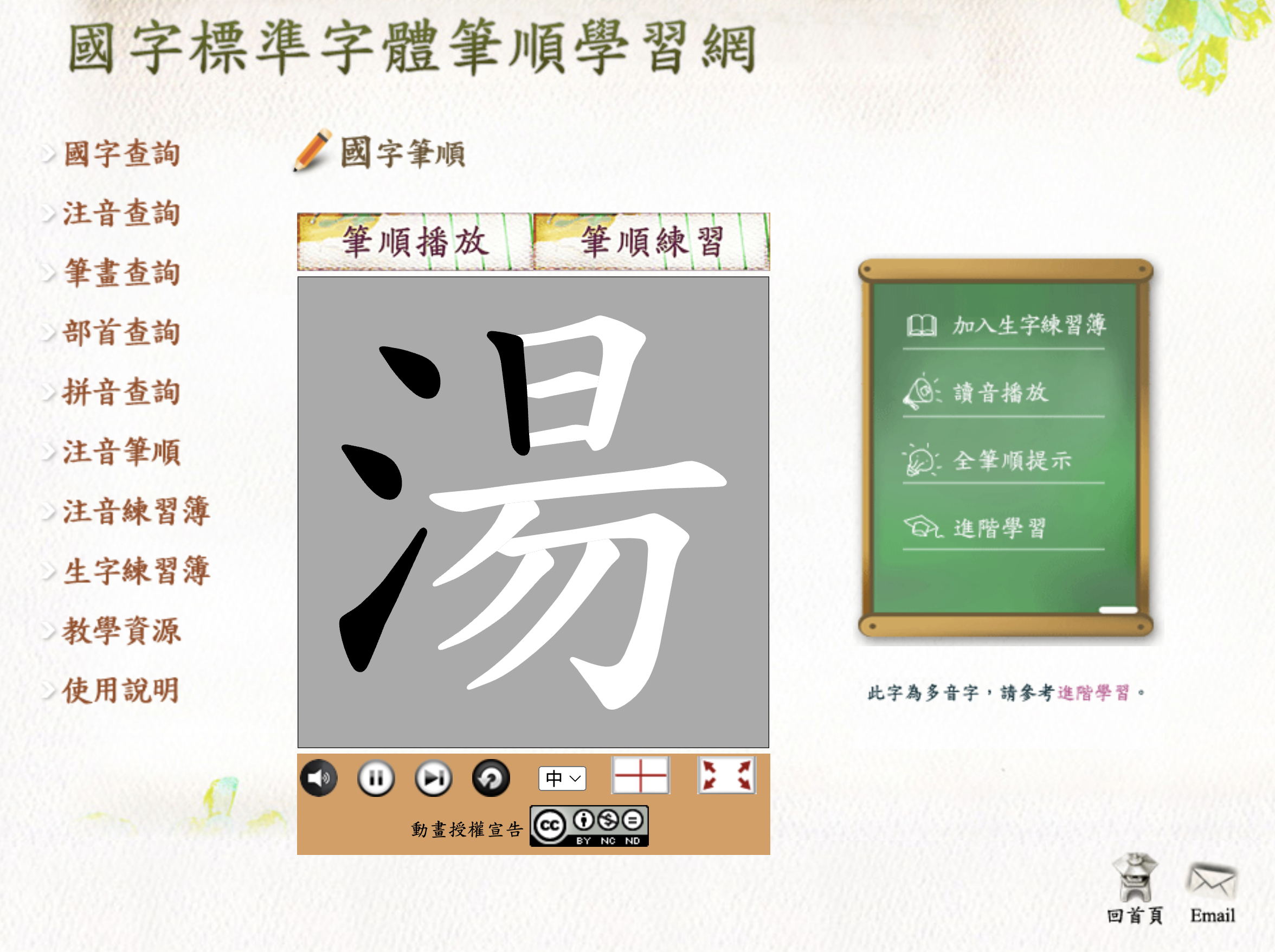 進來之後,左邊的選單就有完整的功能了,查詢的部份包括有國字、注音、筆畫、部首、拼音,以國字查詢為例,輸入湯,按下開始查詢。