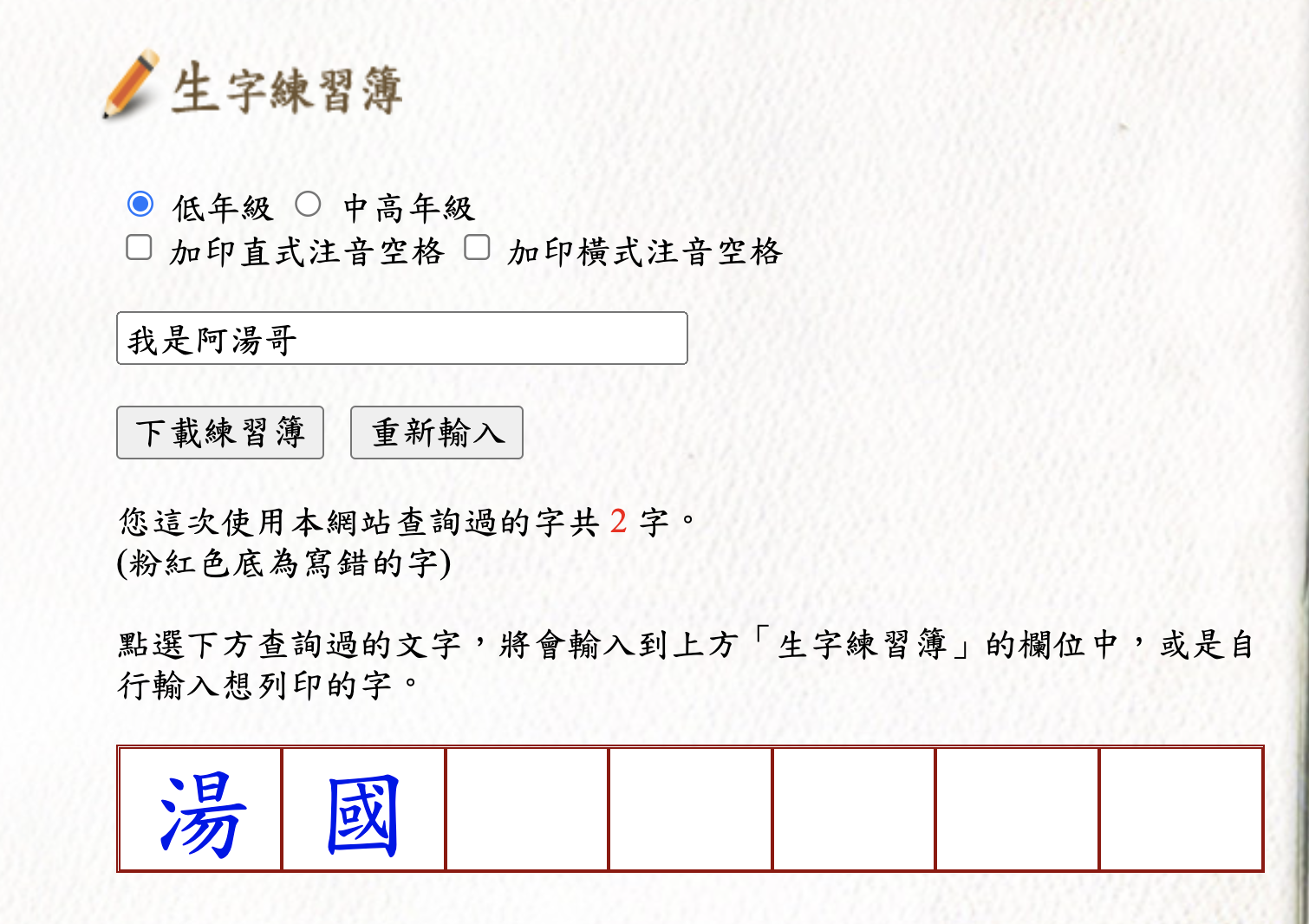 生字練習簿跟之前介紹的差不多,一樣輸入內容後,按下載練習簿,就會獲得一個 PDF 檔案,列印出來就可以了。