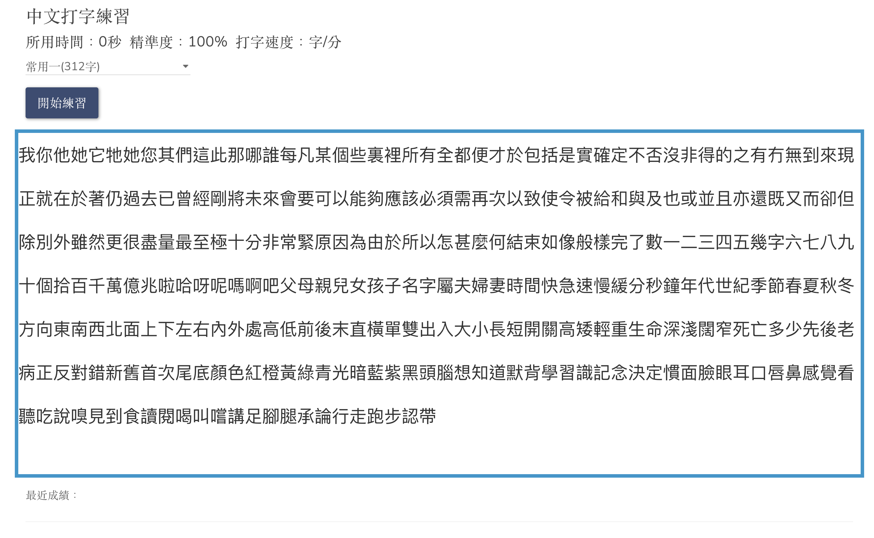 網站:https://www.typing.hk/進入網站後,介面很簡單,上面就是顯示使用的時間,精準度跟打字速度,點擊開始練習就可以直接輸入,用什麼輸入法都可以。