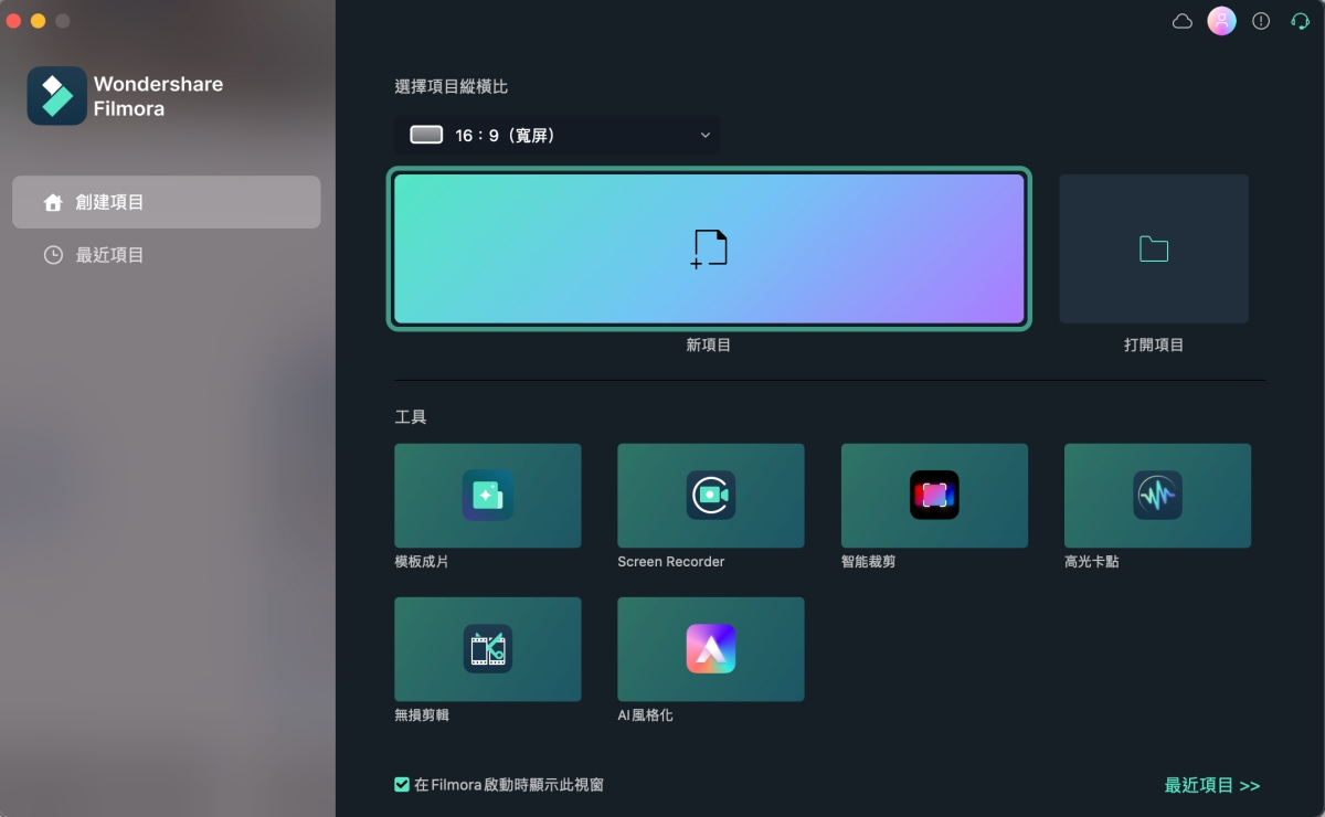 Filmora 的功能很多,除了創建剪輯之外,還有既定的模板可以套用、螢幕錄影、智慧裁剪等各種功能,阿湯往下主要就來分享他的剪輯功能,我想這是大家最需要的部份。