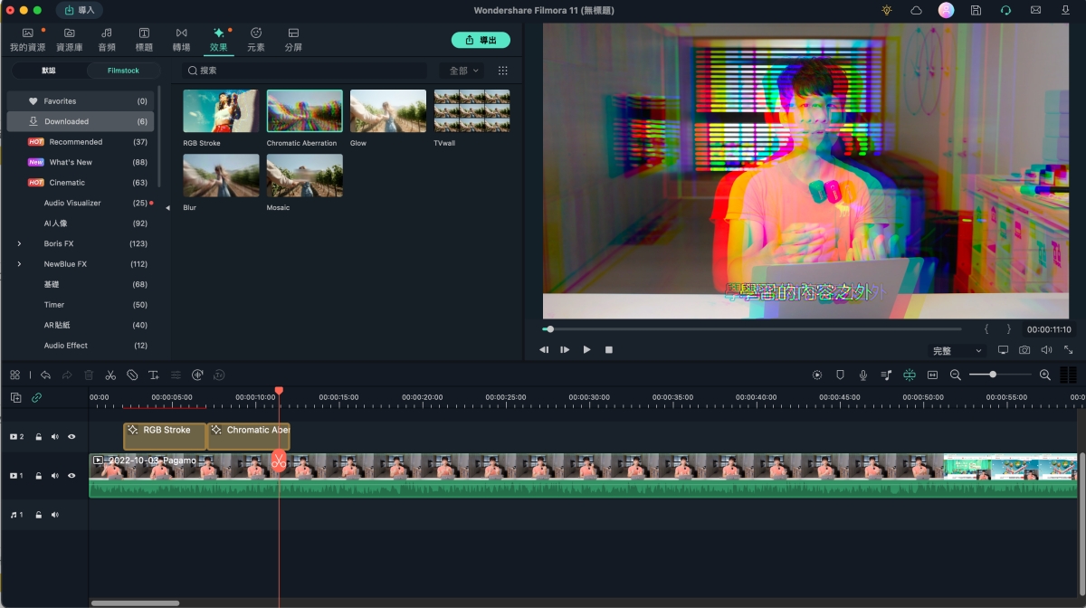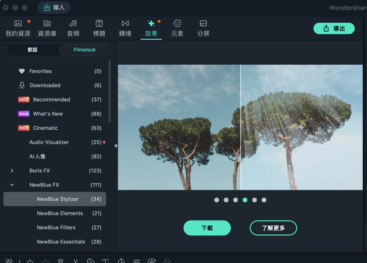 以濾鏡來說,選擇效果後,在左側就有很多內建的效果,依照想要使用的點擊後就會下載,然後就可以套用了,只要拉到下方影片時間輯後再拖曳套用範圍即可,沒有任何難度。