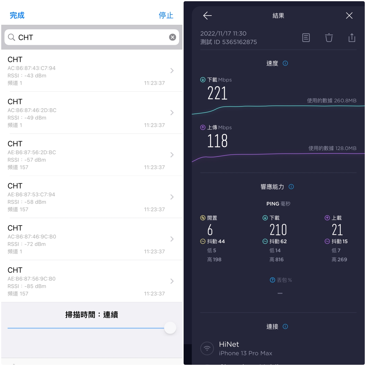 - 速度測試:下載 221Mbps、上傳 118Mbps