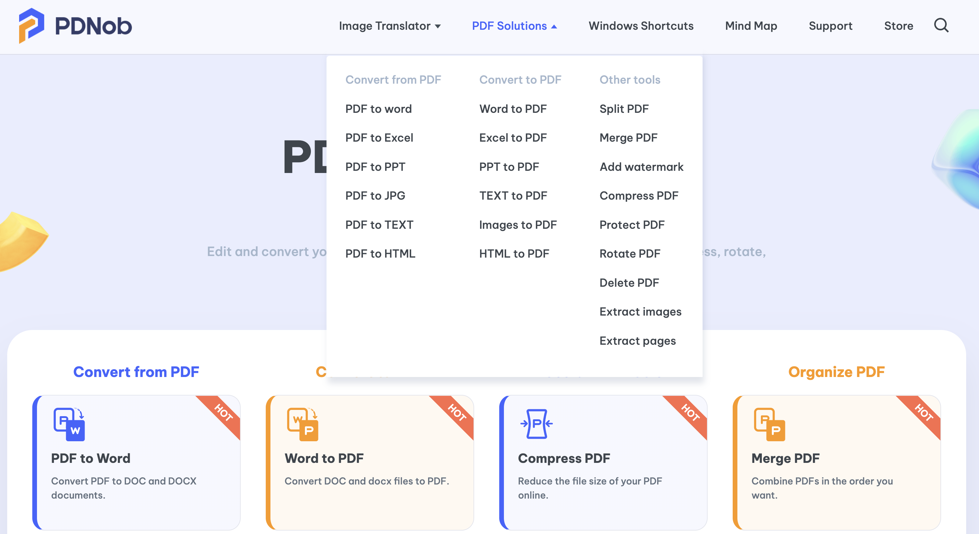 網站:https://www.pdnob.com/products/pdnob-pdf-online.html進入網站後,直接在 PDF Solutoins 這選單下拉就可以看到各種 PDF 工具,目前共有 21 種,光是 PDF 轉檔就佔了 12 種,其他 9 種為 PDF 相關工具。