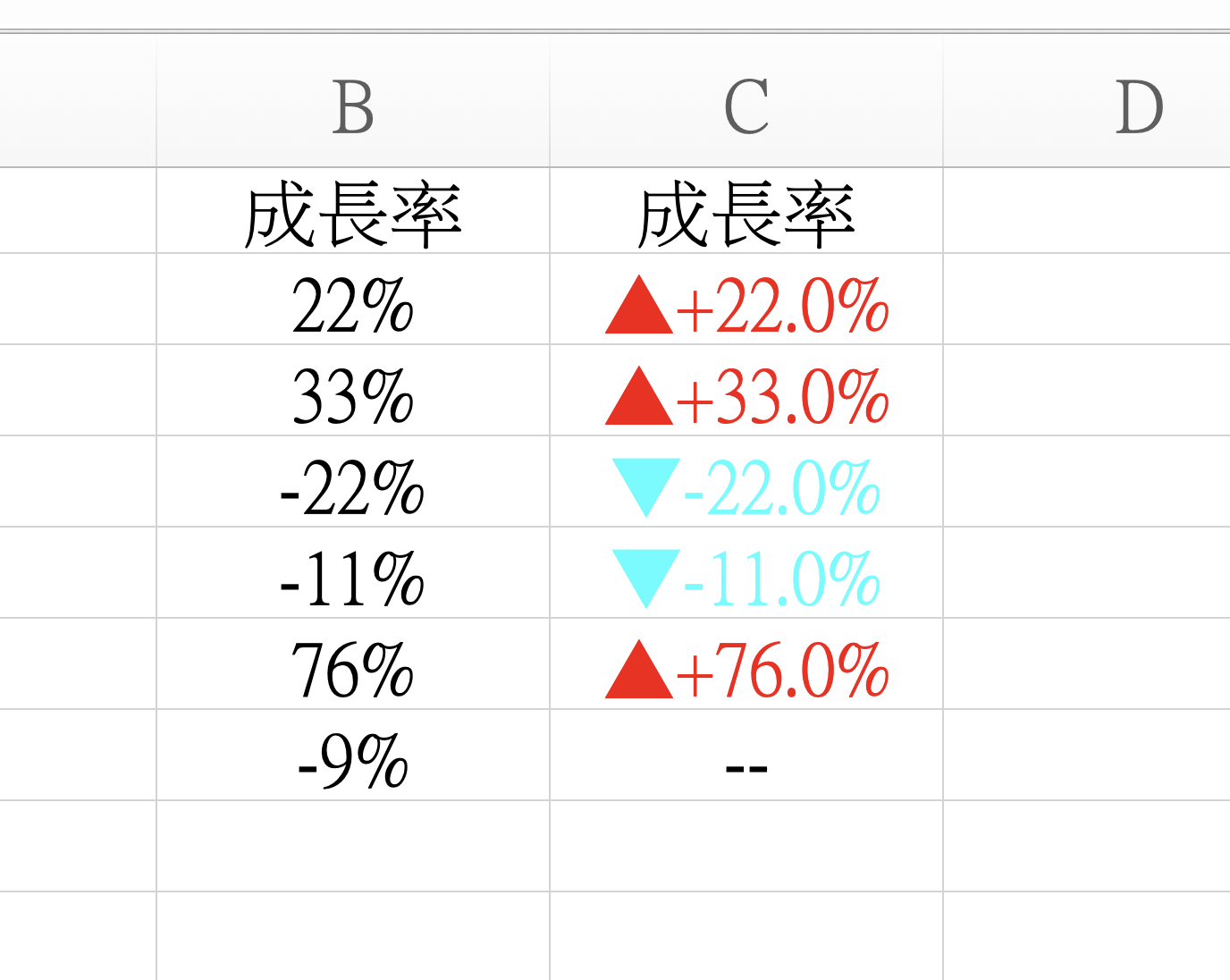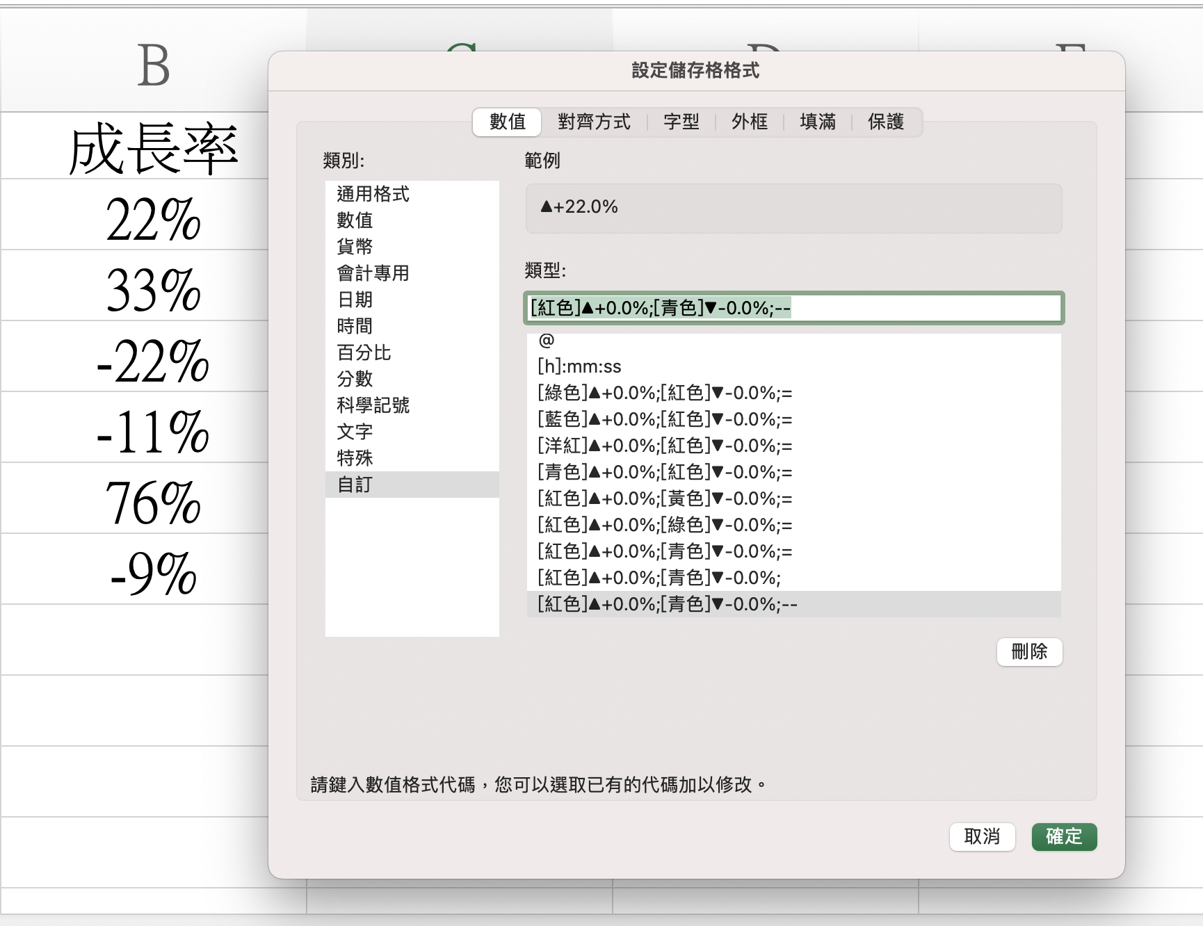 [紅色]▲+0.0%;[青色]▼-0.0%;--至於顏色部份,主要可以填入的有黑色、藍色、綠色、青色、紅色、洋紅、黃色、白色這幾種。 其中最後一個 -- 是當成長率為 0% 不變時,顯示的內容,也可以自行再修改。 而前面的上下符號也可以更換,百分比如果不需要小數點就改成 0% 即可,應該一看就知道怎麼調整。
