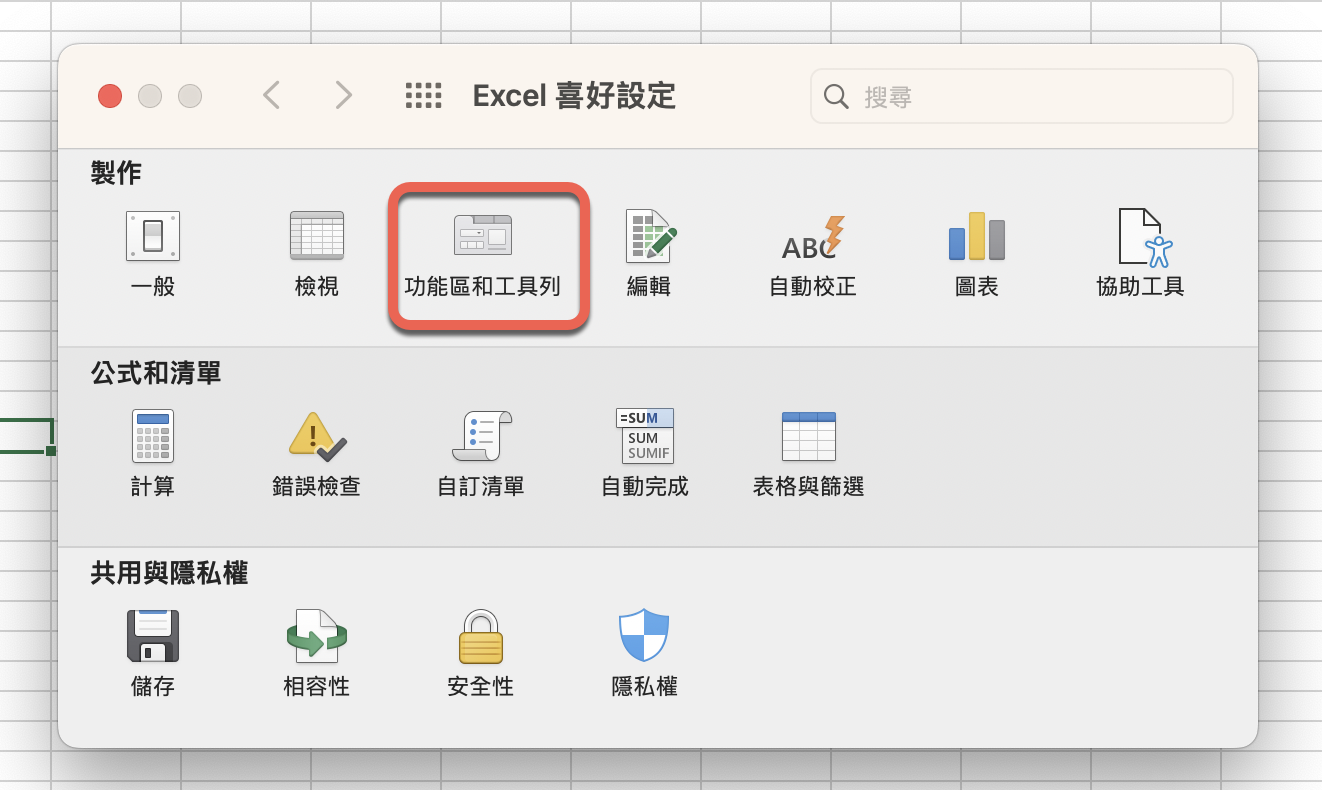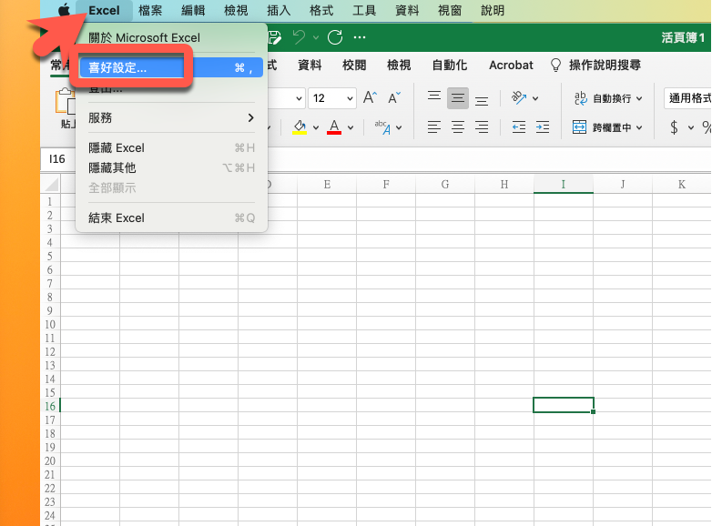 在 Excel 的畫面時,在左上角點擊 Excel > 進入喜好設定。