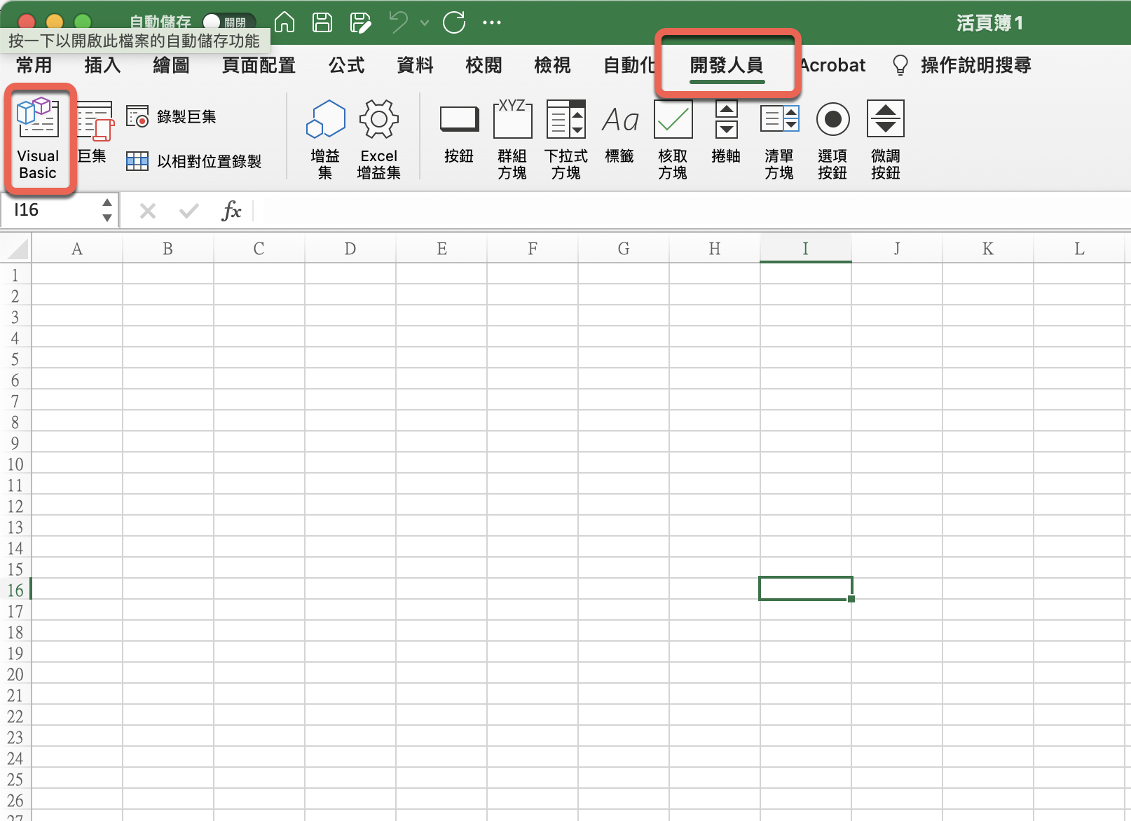 回到 Excel 來看,上方就會多一個開發人員的標籤頁了,就可以在這裡直接開啟 VBA 的編輯器囉。
