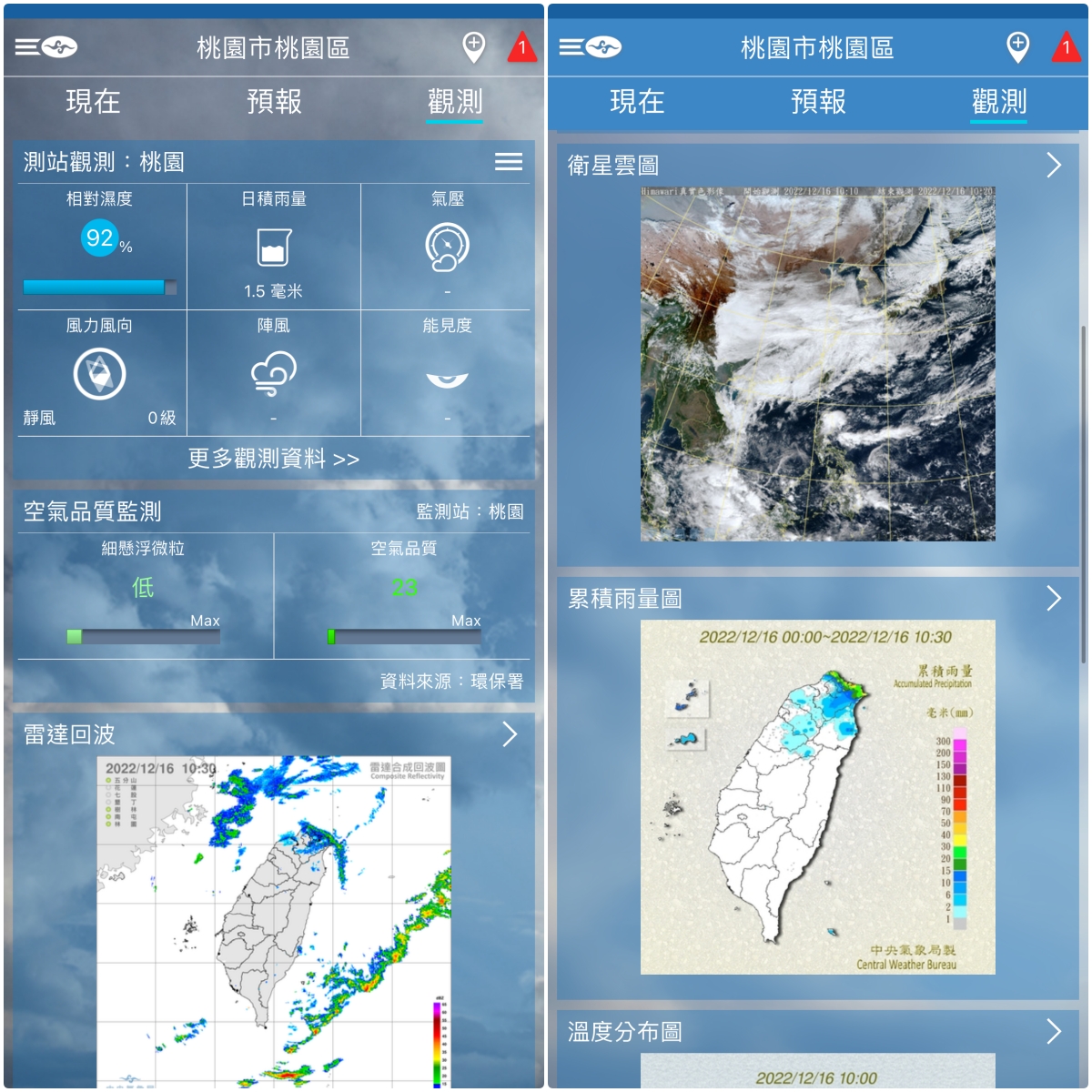 而觀測裡面,就有更詳細的天氣資訊,包括濕度/雨量/氣壓/風力風向/能見度/衛星雲圖/雷達回波等,不用上中央氣象局網站全部都在 App 裡就能查看。