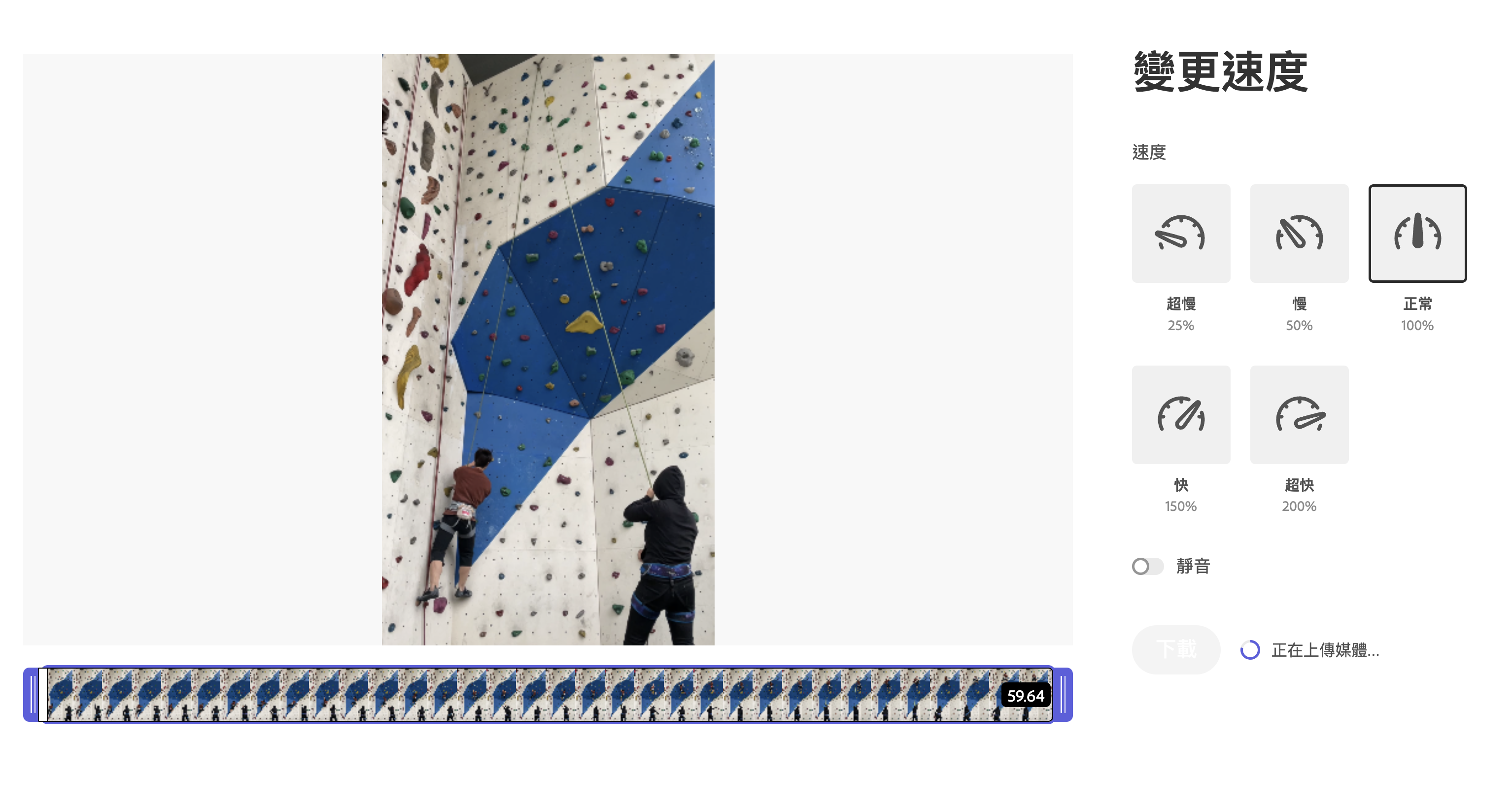 上傳影片後就可以選擇速度的變化,從放慢四倍的 25% 到加快的 200%,比較可惜的是不能自訂速度,不過一般這幾個選項也很夠用了。