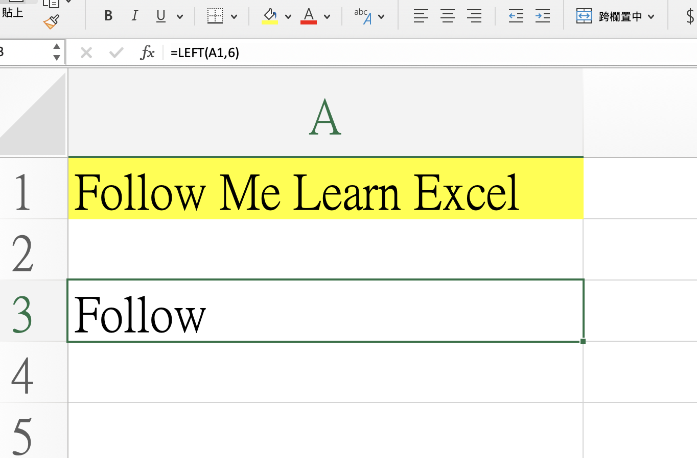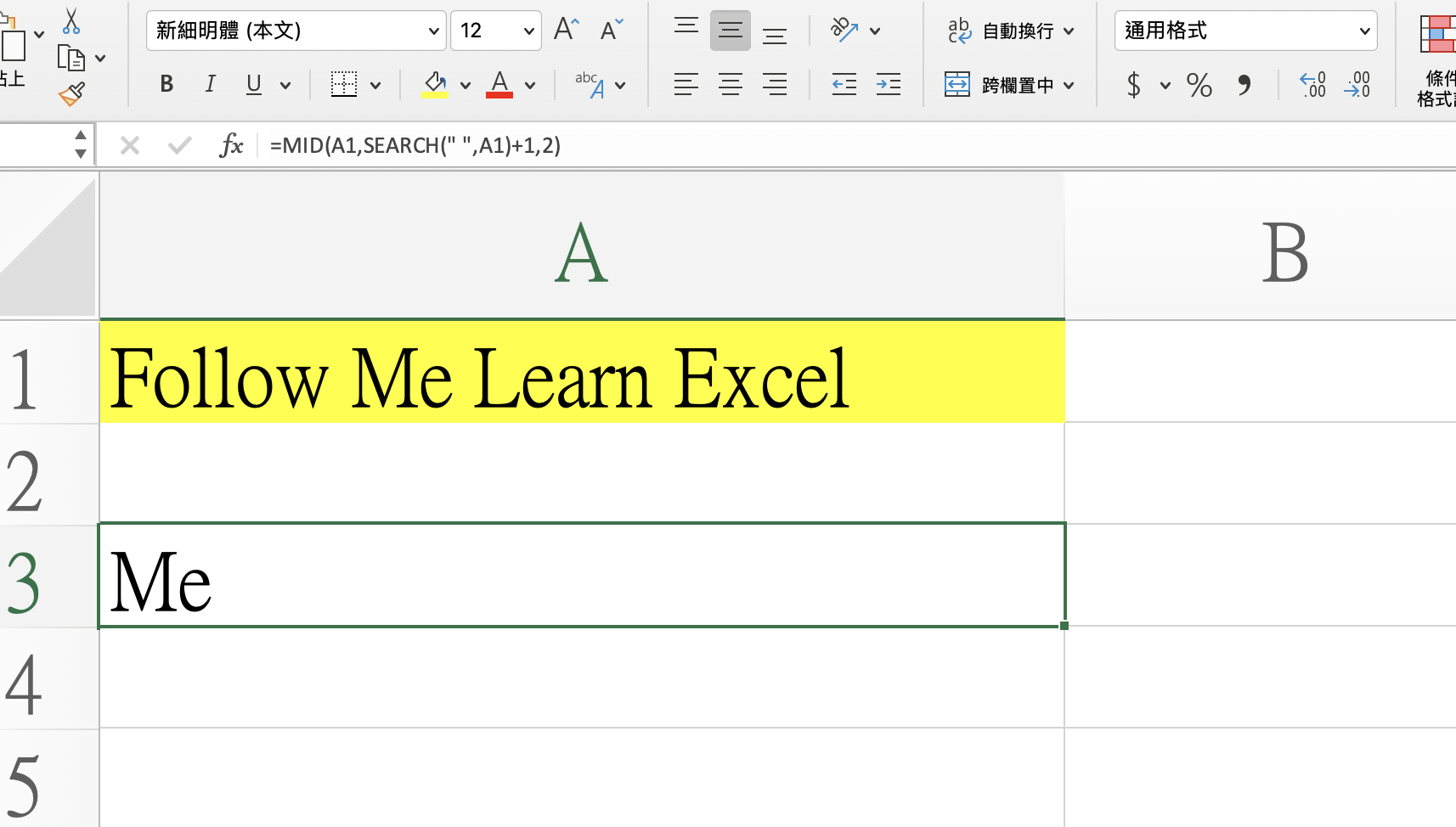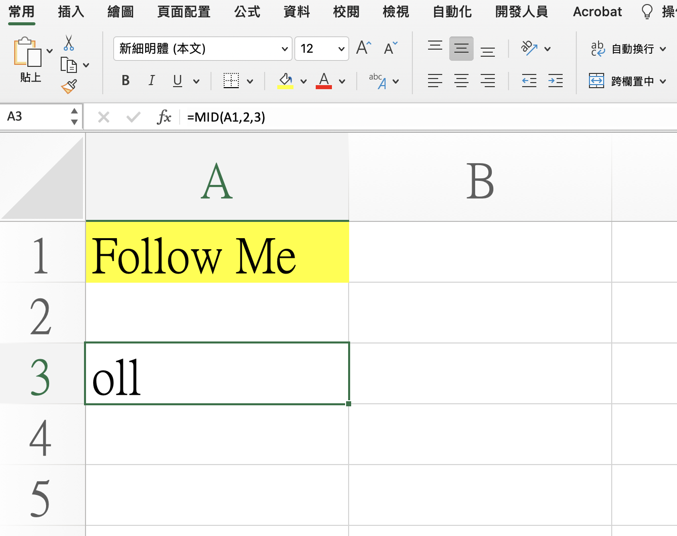 首先我們先從最簡單的 MID 開始,非常好理解且公式也很單純的一個函數,比如像下圖,字串 A1 是 Follow Me,那麼我們公式如下: