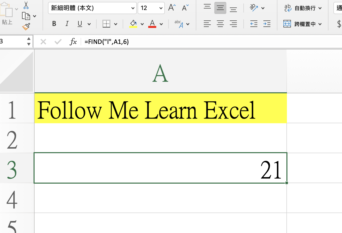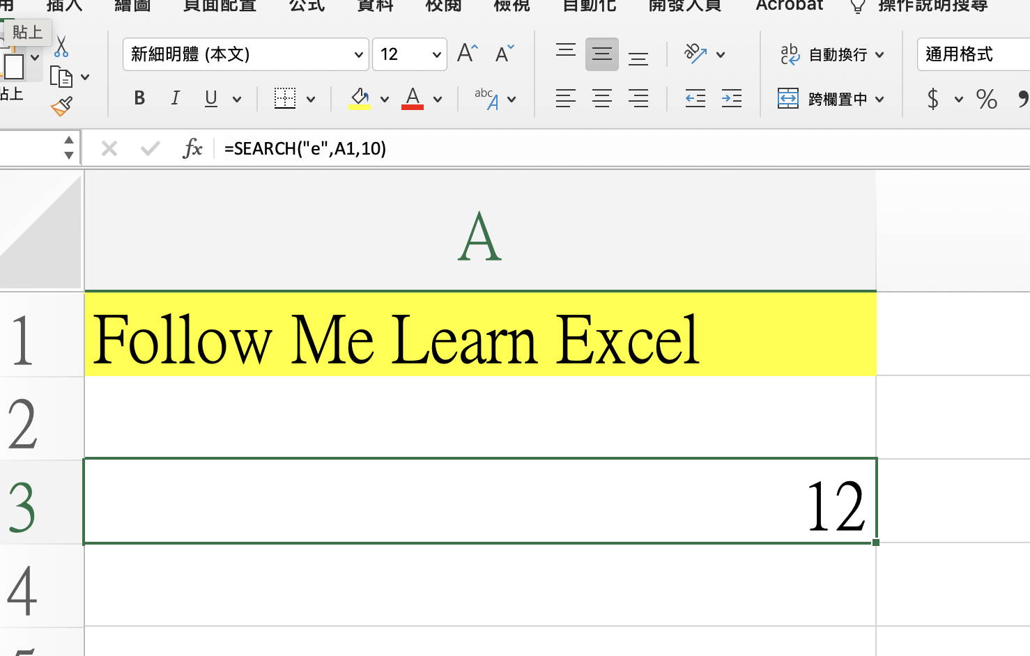 在 A1 欄位中,從第 10 個字串開始找出 e 是在第幾個字元,所以獲得了 12,同樣是非常好理解的一個函數