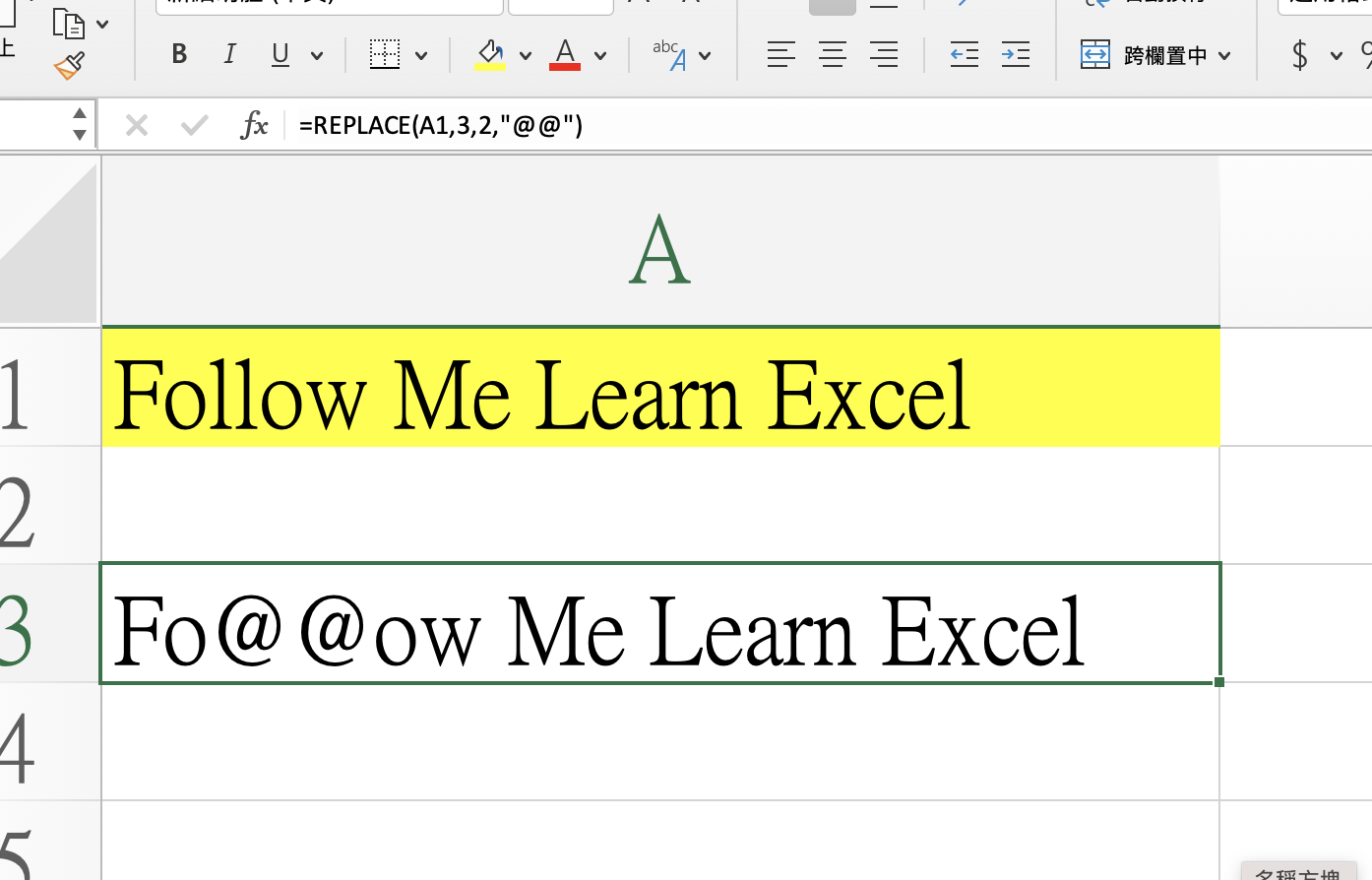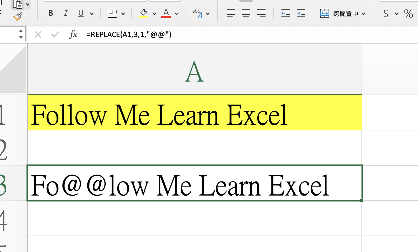 比如我將公式調整了一下,改為取代第 3 個字元開始的 1 個字元被取代,那麼我要取代的字元如有二個 @@ 會怎麼取代?看到原本的 Follow 變成了 Fo@@low,不論你想放進去的字元有幾個都沒關係,就是按照你設定的,第 3 個字元開始的 1 個字元,取代成你想要的內容,不要把他想的太複雜。