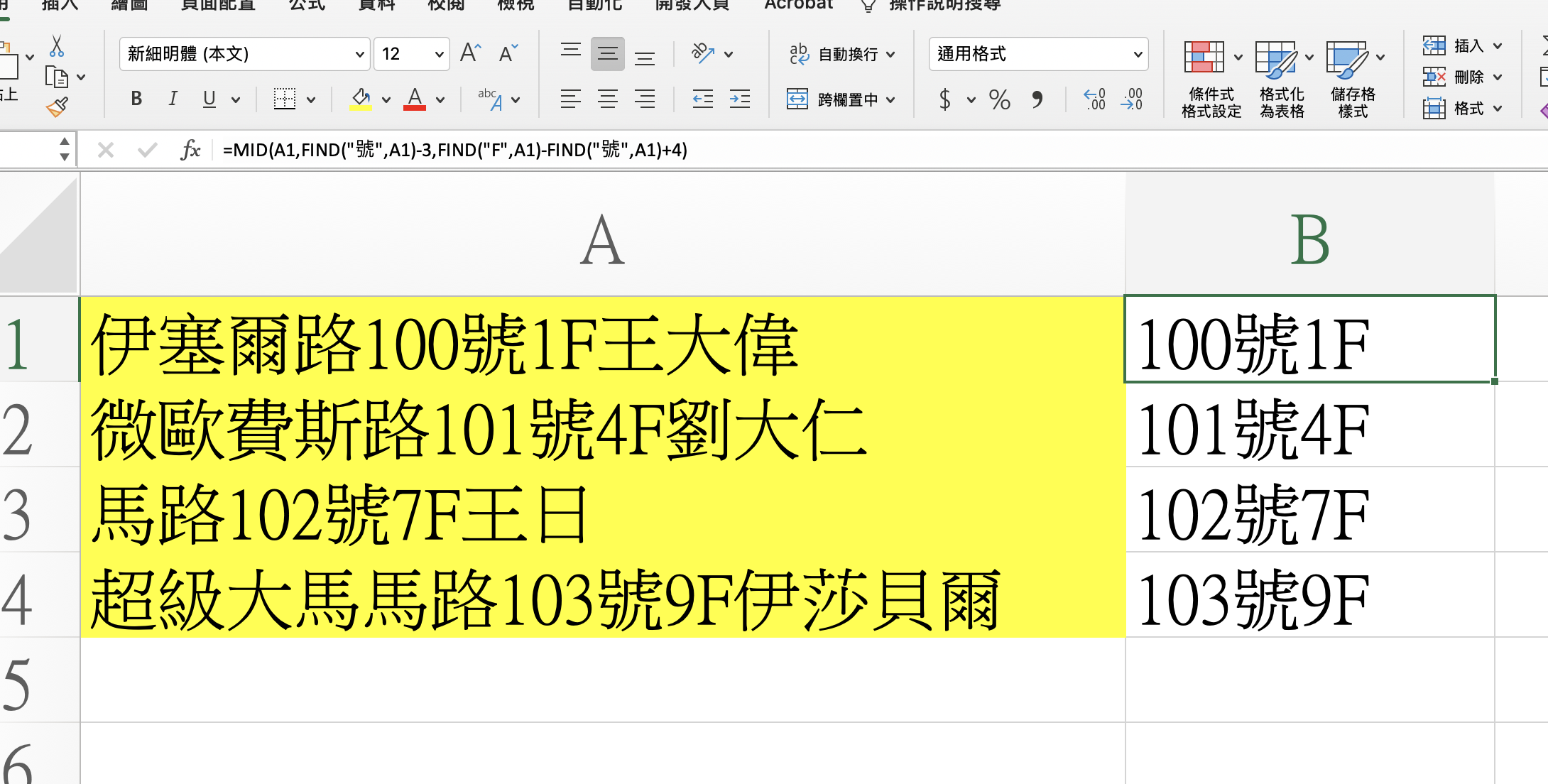 我們目標是取出這裡面的號跟樓層,共通點是號的數字位數相同,結尾都有 F,所以我們要做的 MID 函數,其中第二個參數是從第幾個字元開始,由於左邊的路字元數都不同,我們不能使用 LEFT,所以我改用 FIND 來定位"號"這個字,透過 FIND("號",A1)-3,就可以找到第一個要定位的位置,FIND 找到號後有個 -3 就是往前 3 個字元剛好符合三位數的號。