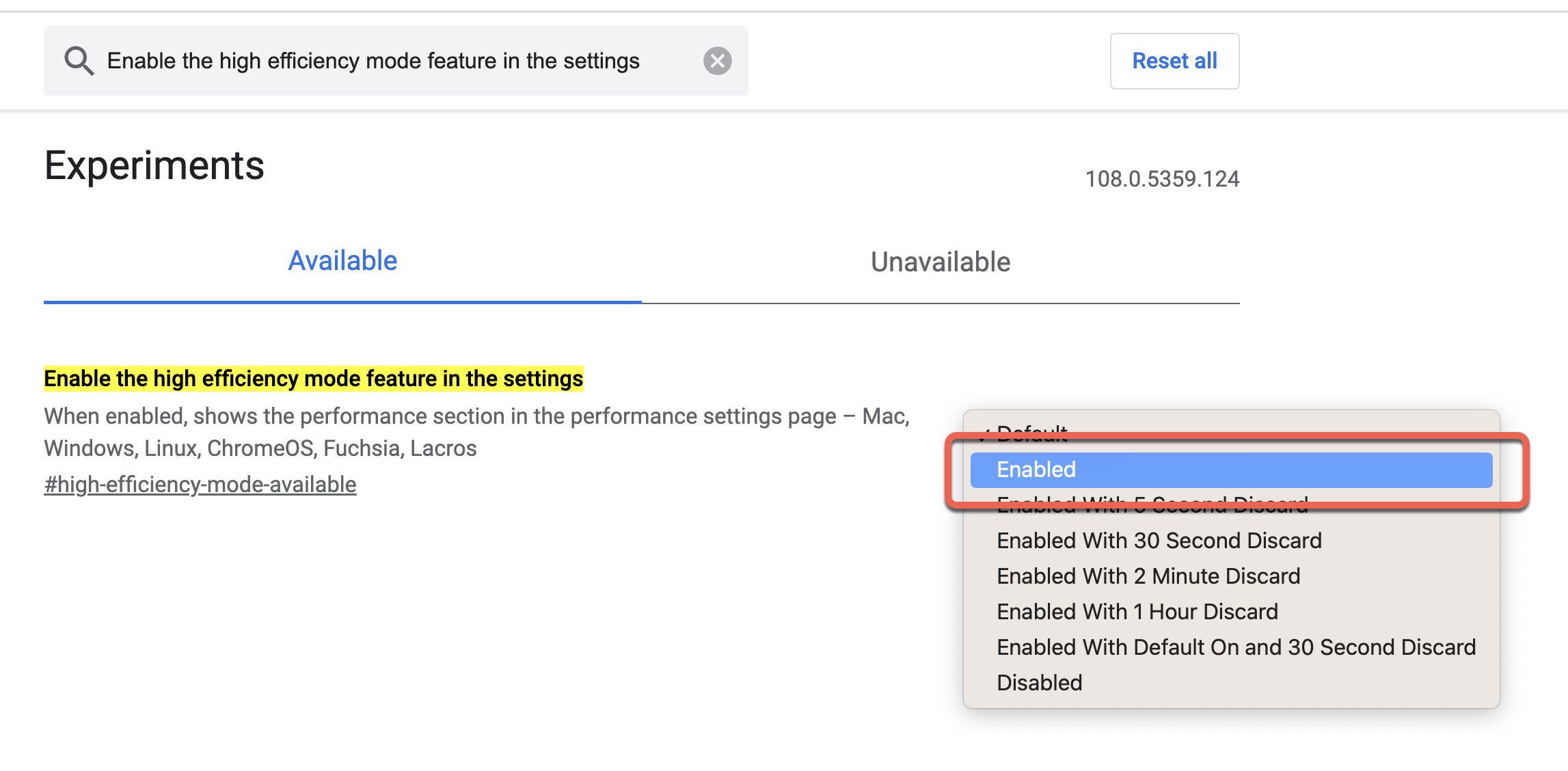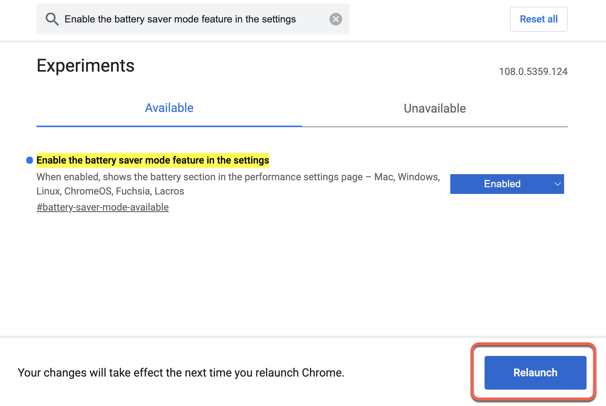 然後搜尋「Enable the high efficiency mode feature in the settings」,就可以找到這個模式,將它改為 Enabled,如果你要順便開啟電源節能模式的話,就先往下看,如果是桌電要用的話,那麼可以直接在右下角按下「Relanuch」重啟瀏覽器即可。