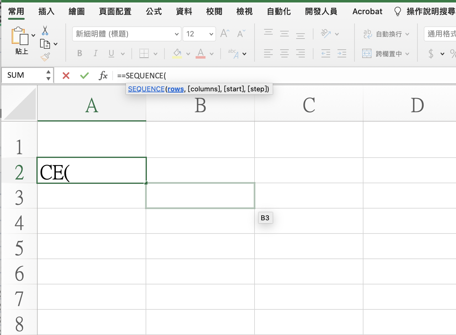 首先我們在 Excel 的公式列上先打個 =SEQUENCE,就可以看到完整的參數欄位,一共有四個,如果輸入完整的公式:
