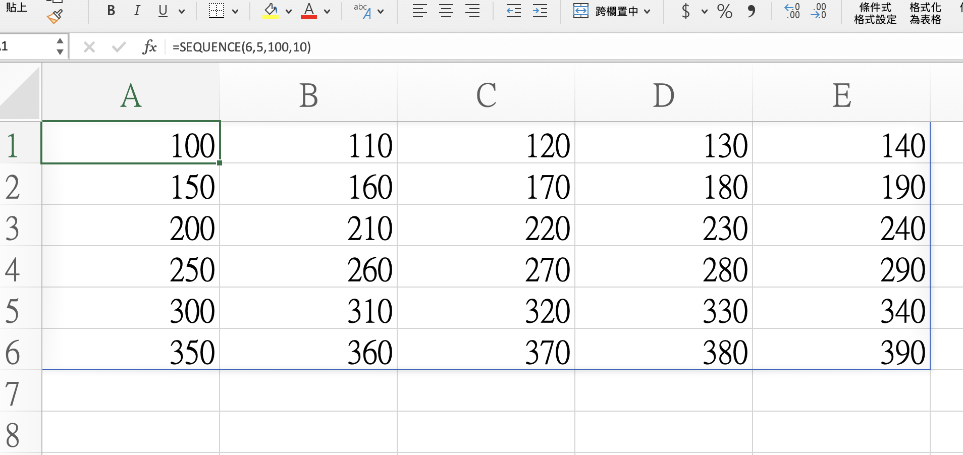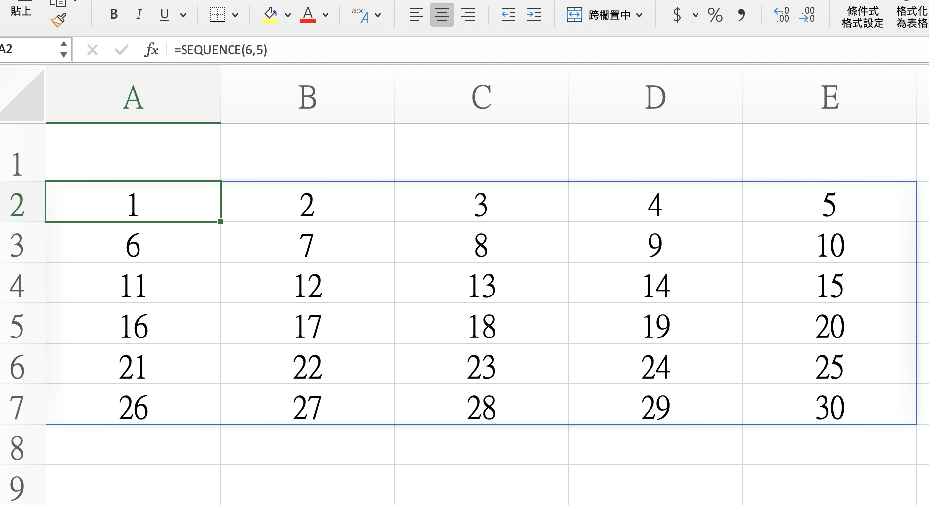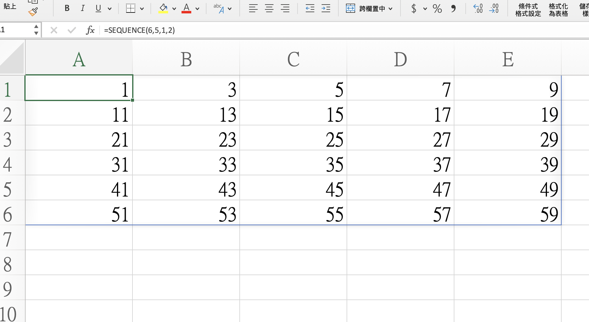 再來放滿四個參數給大家看一下,除了前面一樣,是創造了六行五列的陣列外,第三個參數是代表從 1 開始置入,第四個參數代表是每個間隔 2,所以我們就建立了一個 1,3,5,7 的等差級數了,比起以往要建立出相當的陣列值,使用的公式只要一個,簡單的太多。