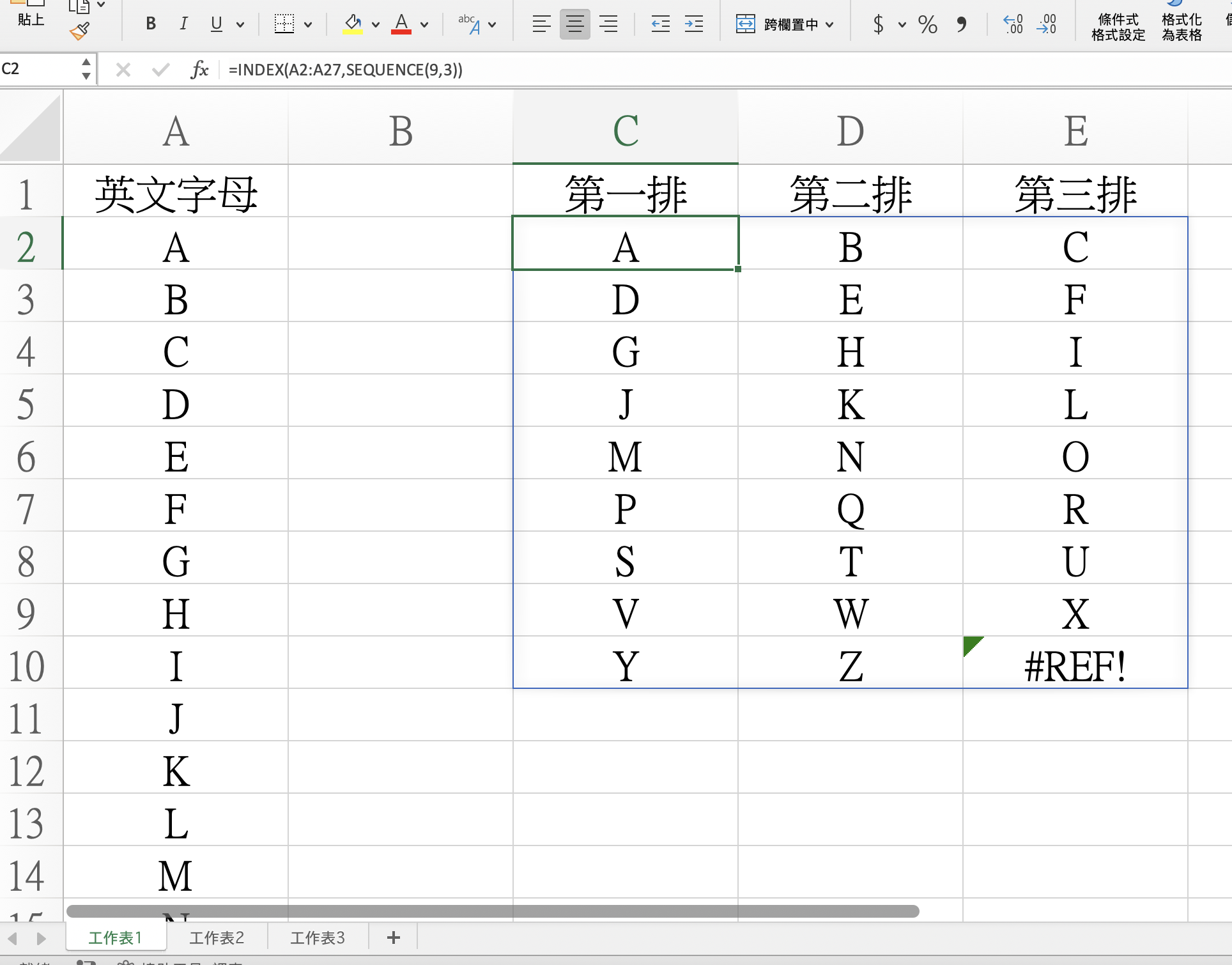 範例公式:=INDEX(A2:A27,SEQUENCE(9,3))
