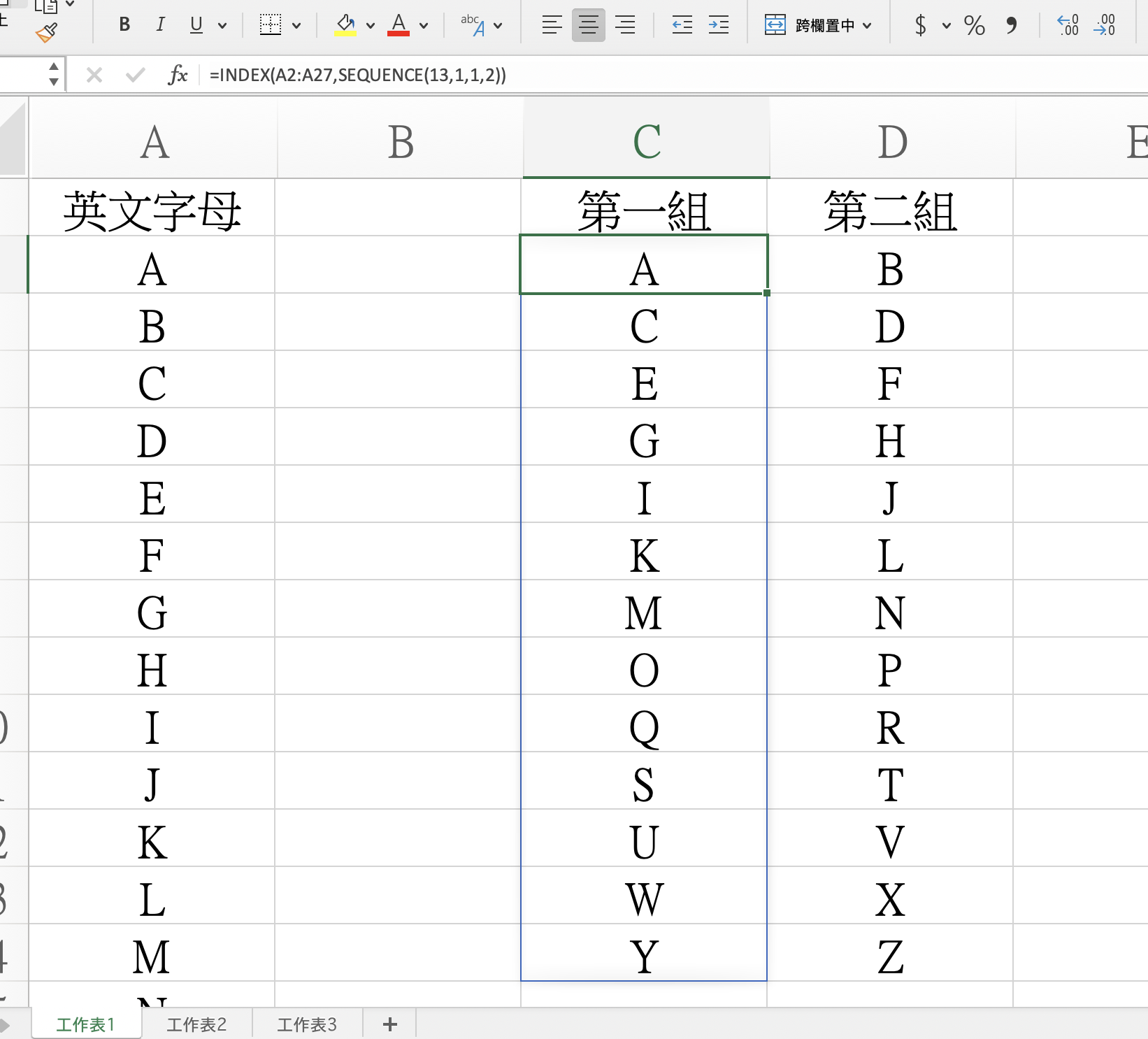 範例公式 C2:=INDEX(A2:A27,SEQUENCE(13,1,1,2))