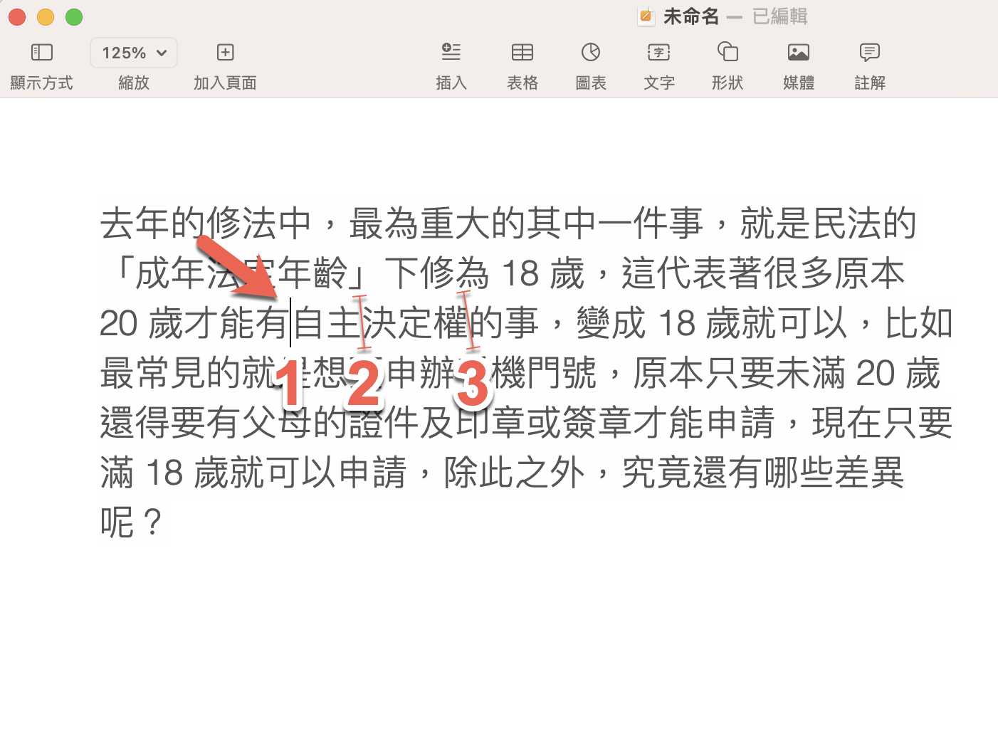 那中文的話呢?這單字跳點大法有效嗎?答是有的,只是會依照字詞來跳,比如像我標示 1 到 3 的位置,是「自主」「決定權」,會按照內建的詞庫來跳點,所以在 1 的地方往右跳點,就會是「自主」這個詞,再下一個是「決定權」,這樣懂了嗎?