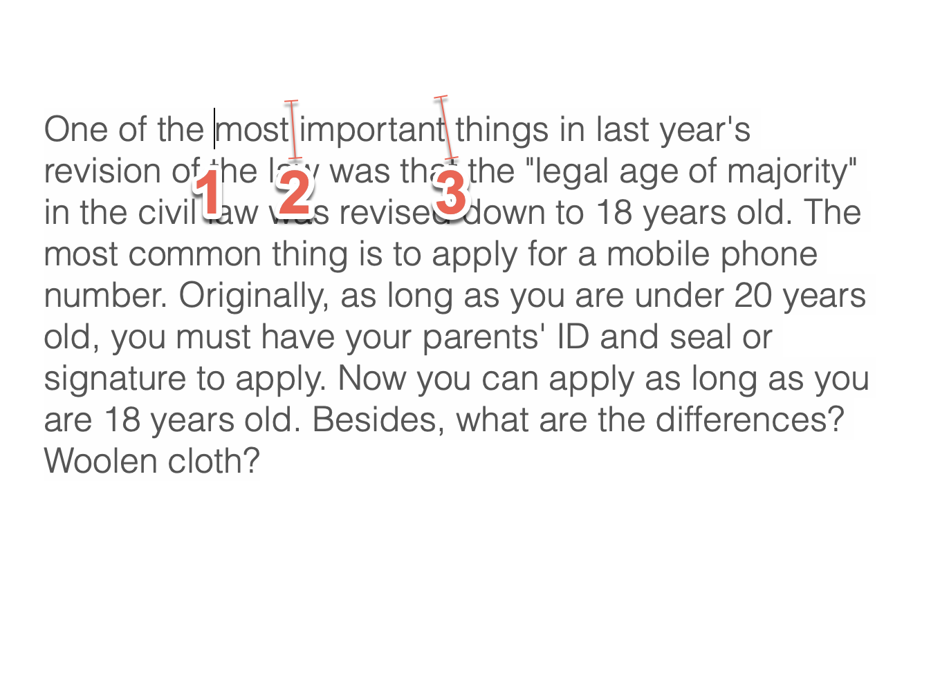 當我們在編輯內容時,以英文為例,如果單純的用鍵盤要移動一個單字的距離,你要按非常多下方向鍵才能達成,比如下圖的 1 移到 2,一個 most 就要按 4 下往右才能到下一個單字,如果像 2 移到到 3,impoartant 這單字就得按 9 次,正常你應該會放棄用鍵盤移動,直接用滑鼠,這邊來教大家一個「單字跳點大法」,讓你在用鍵盤的情況下,可以每次準確的移動一個單字的距離。